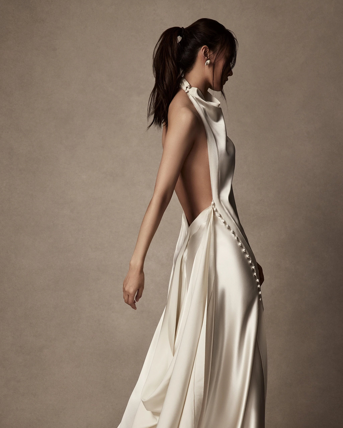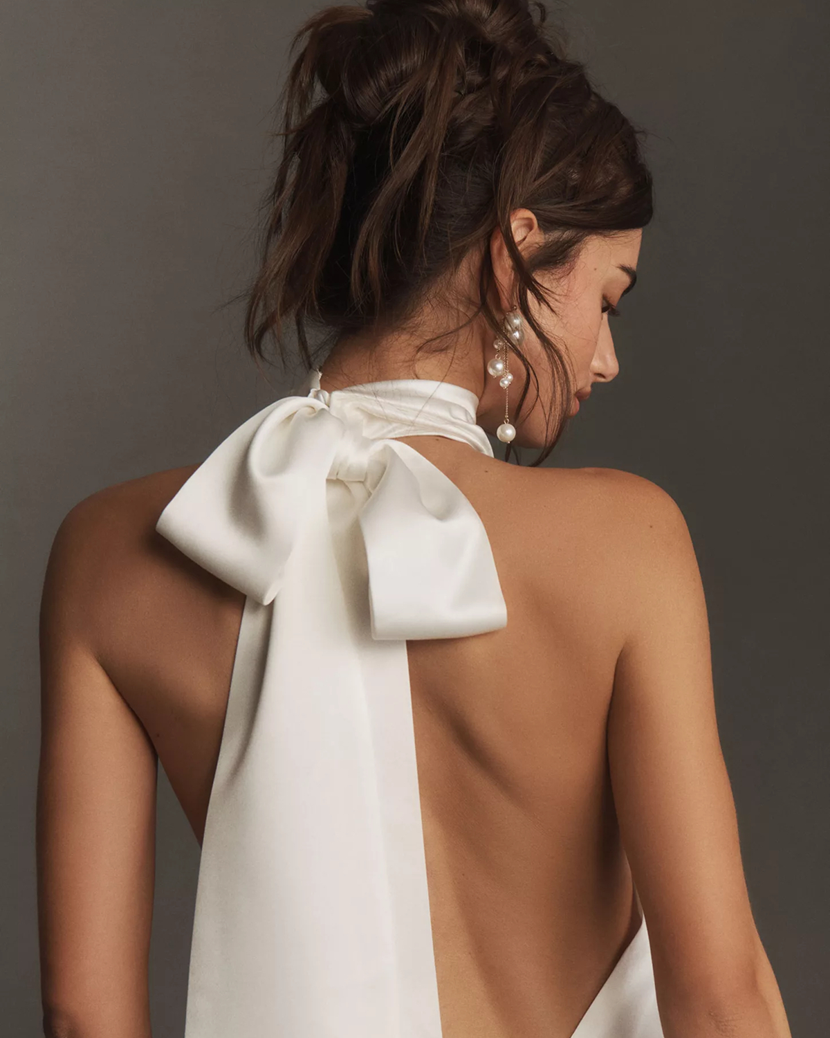 When your dress makes a statement from the back, a playful ponytail is the ideal finishing touch. Soft texture, gentle volume, and a few face-framing strands to keep things romantic will allow the back of your gown to take center stage. Plus, you'll still feel bridal and styled—never too perfect, always just right.