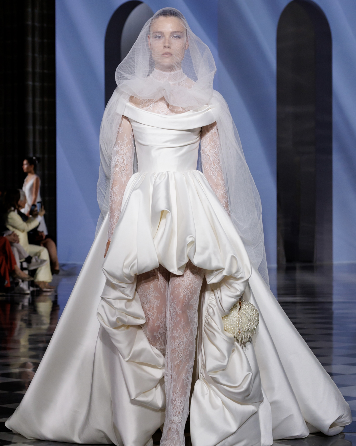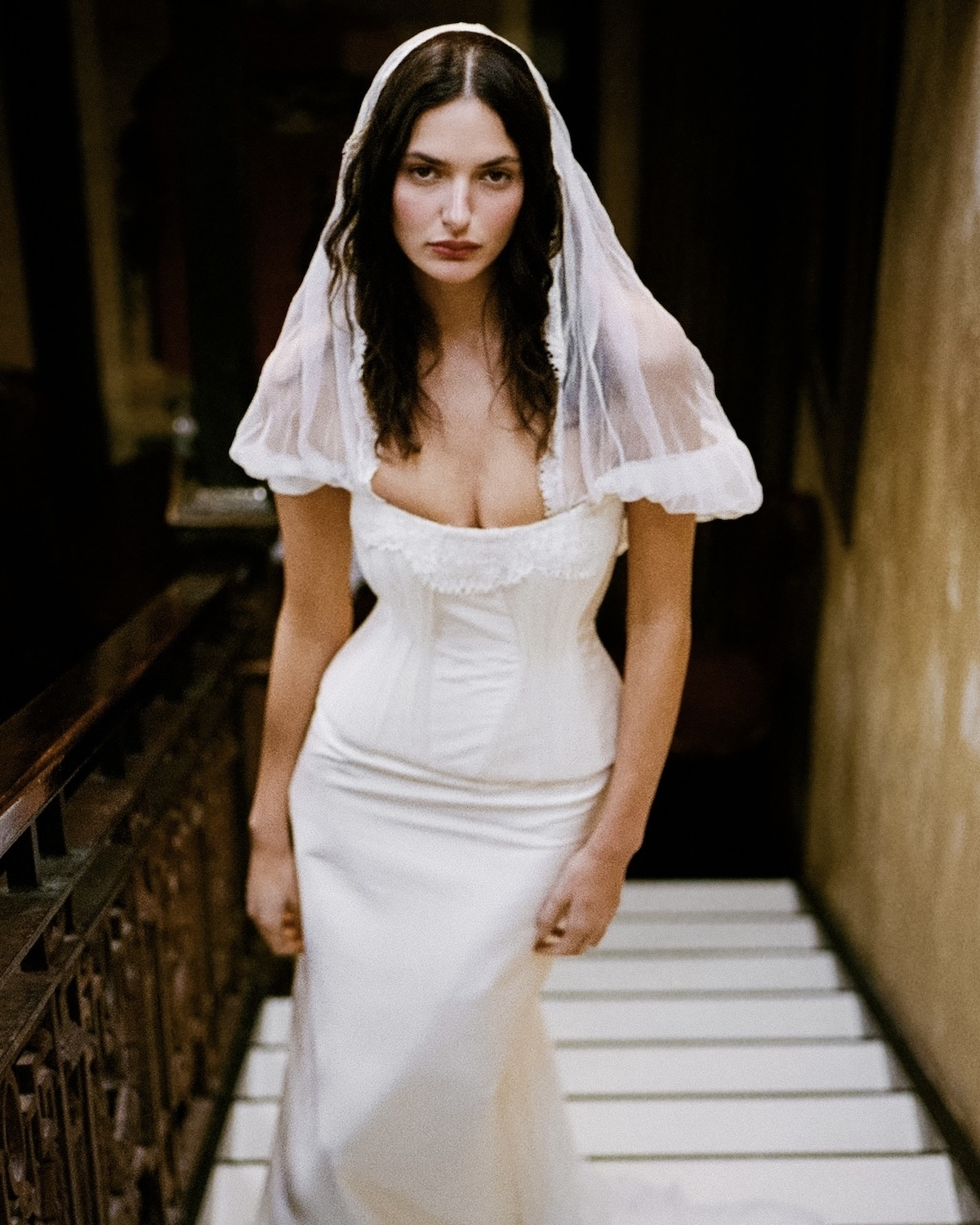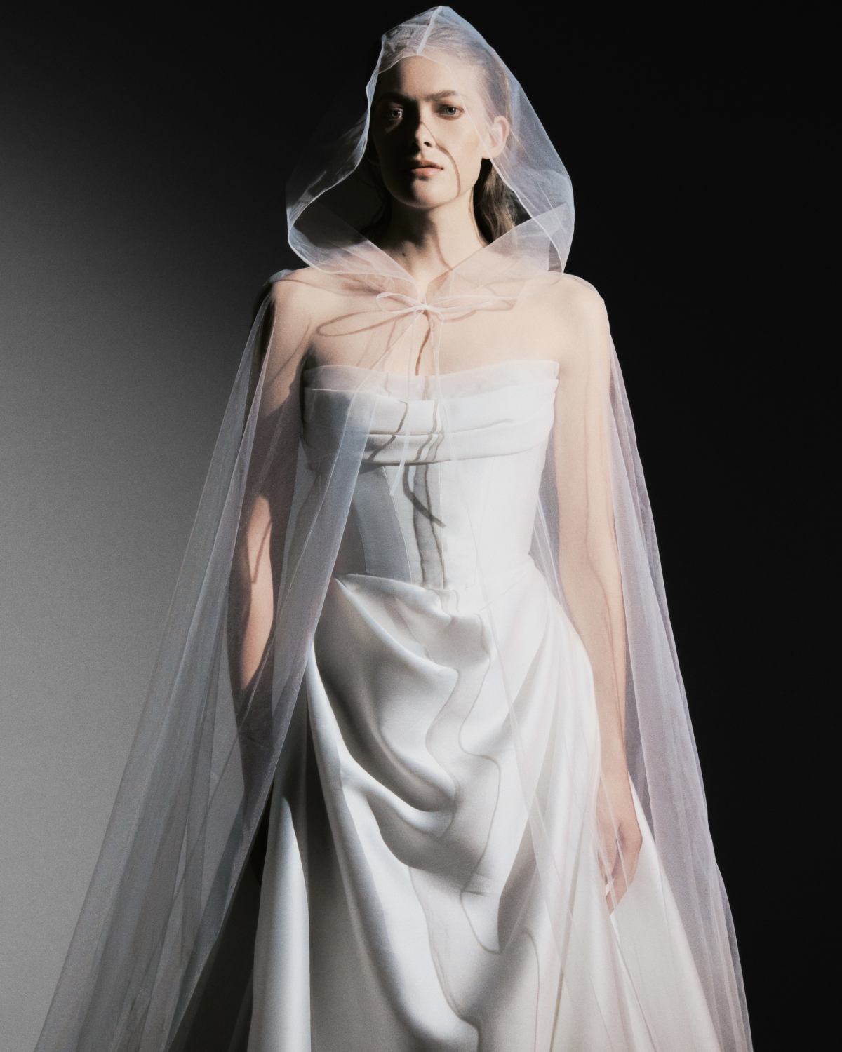 Straight from the latest bridal collections, pairing a hooded veil with a structured, corset gown creates an equal parts regal, and equal parts contemporary look. The hood's dramatic drape adds an air of mystery and high-fashion drama, while the corset silhouette's sharp lines and refined waist add strength and femininity.