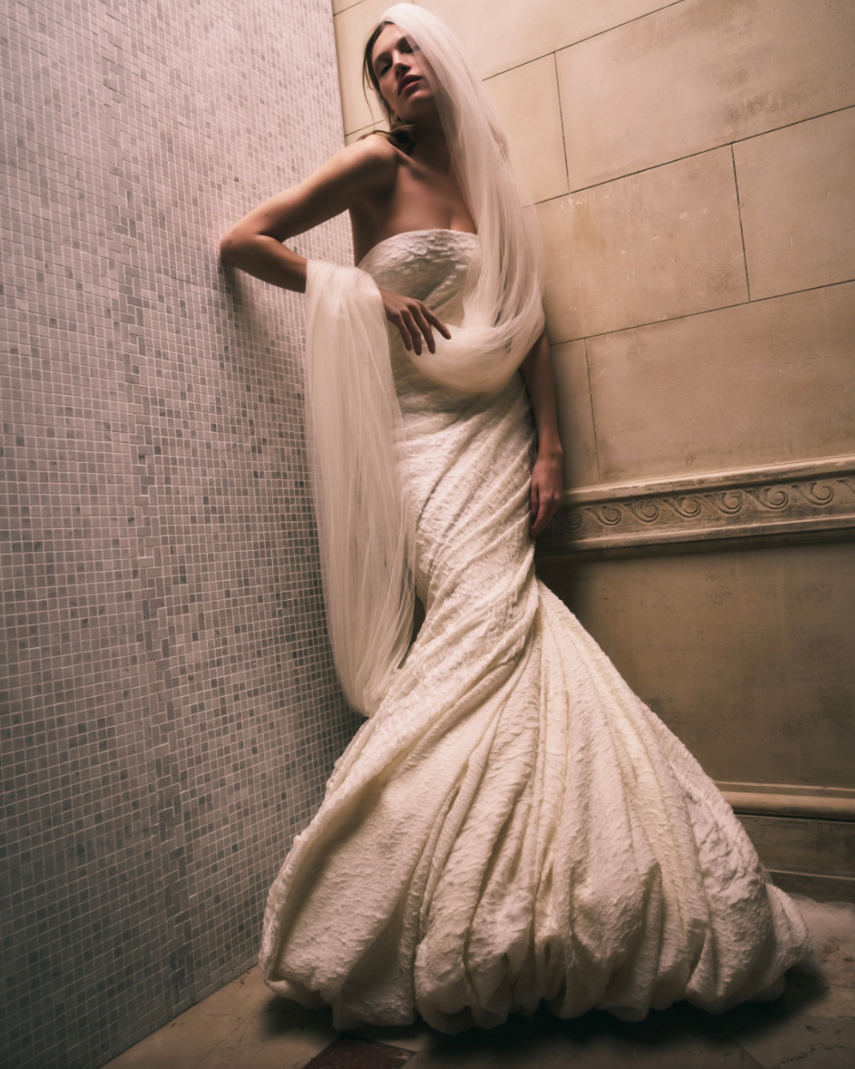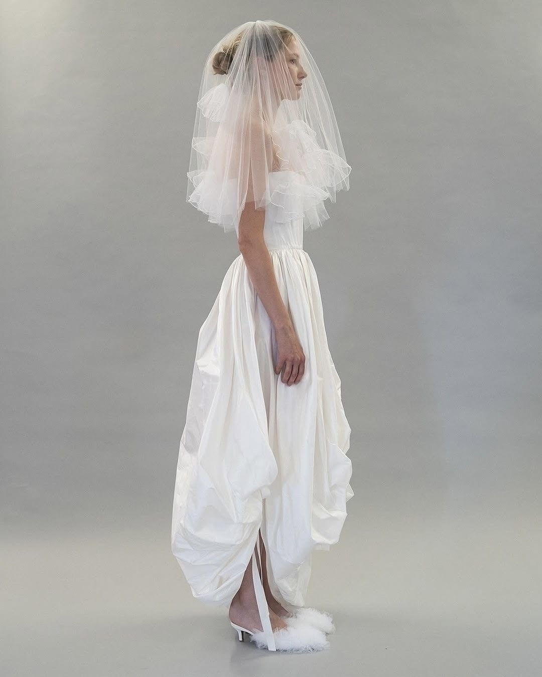 Looking for the perfect pairing for a voluminous bubble dress? A fingertip-length veil is a chic choice that elongates the body while letting the sculptural silhouette take center stage. Sitting just above the hips, it highlights the gown’s signature curves without competing with them.
