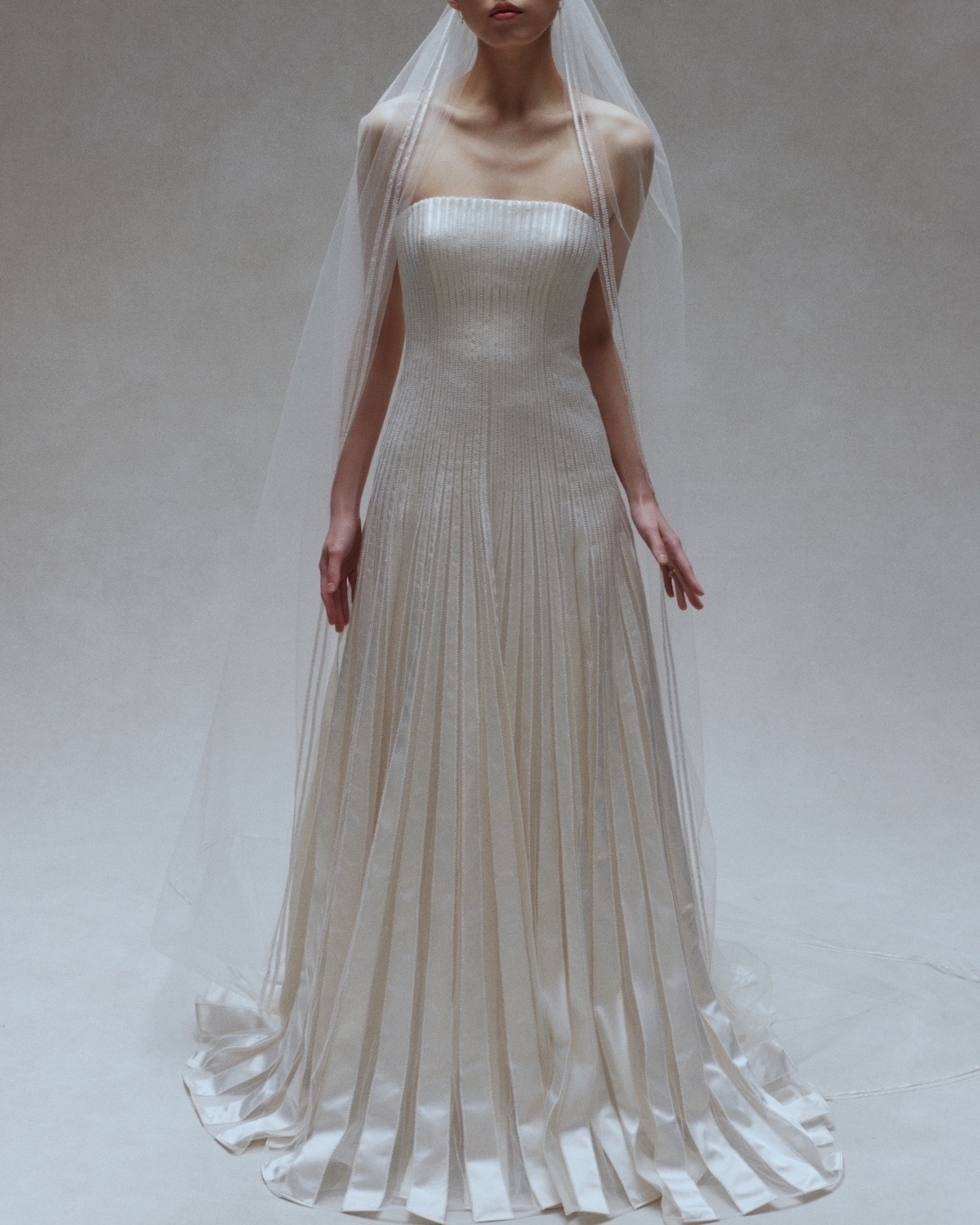 Want true bridal drama? A cathedral-length veil behind a voluminous ball gown should be your ultimate choice. This combination is perfect for making a grand entrance – think cinematic, royal-inspired and truly unforgettable. The extended structure of the veil will add an undeniable mesmerizing effect while balancing the volume of the skirt.