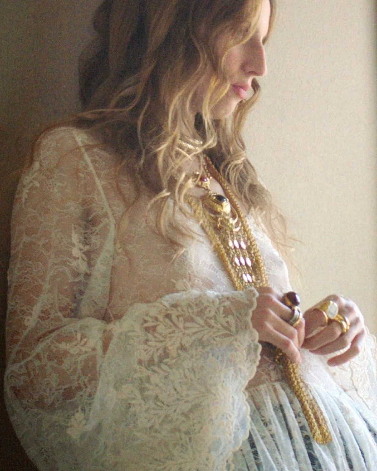 Forget minimalism, boho is all about jewelry that tells a story. From artisanal headpieces to long drop pendant necklaces, stacked bangles, and layered anklet chains worn together in unexpected combinations create a look rich with texture while elevating vintage fabrications. It's the final chapter of a bohemian bridal look for a soulful, dimensional, and incredibly chic moment.