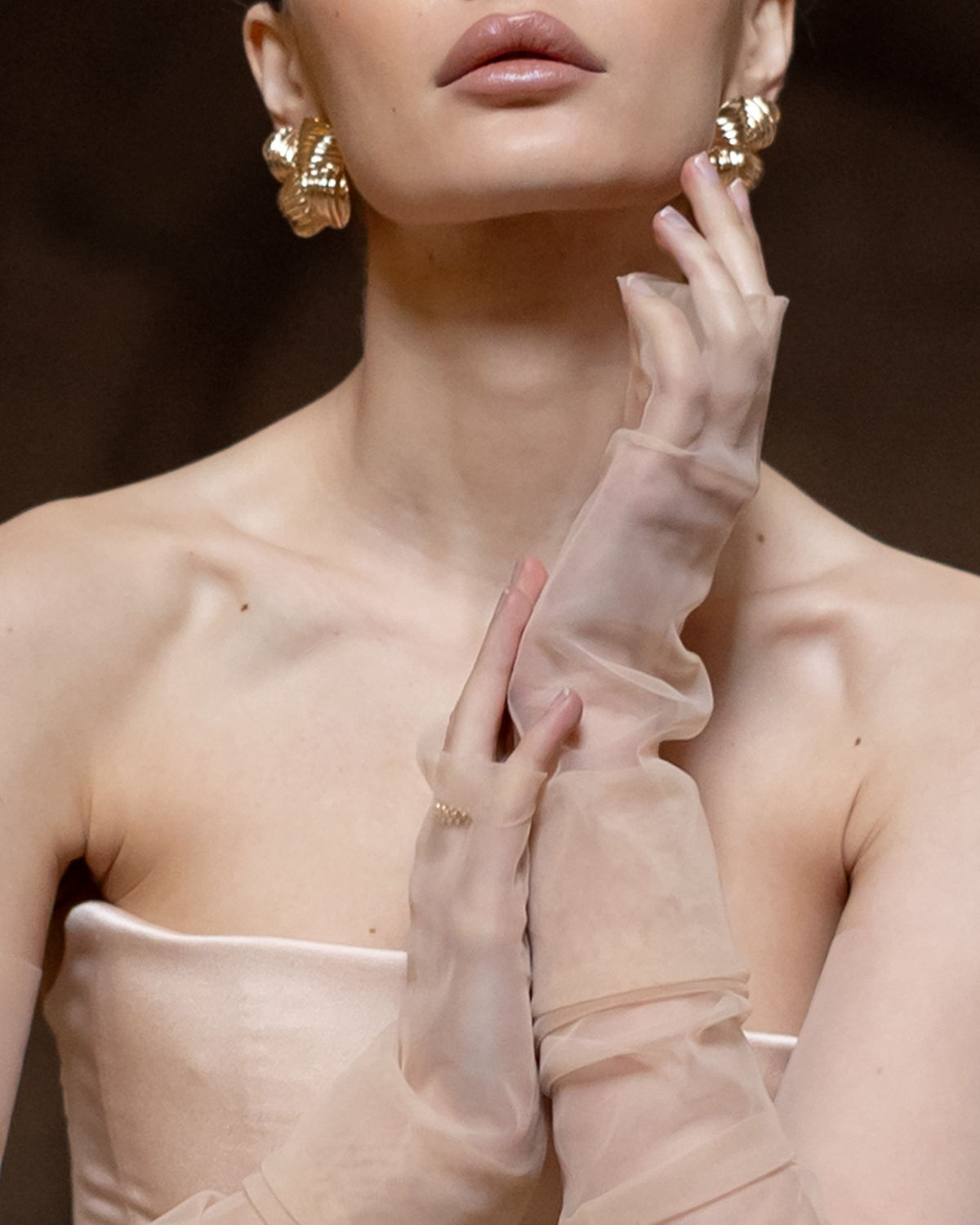 The architectural lines of the library’s staircase and carved balustrades envelope the bride in soft, golden light, amplifying the gown’s fluid structure and petal-like details. In every shot, a deliberate study in contrast takes shape: hard marble meets soft tulle, classic silhouettes collide with sharp editorial posing, and the stillness of stone balances the motion of silk. This tension between elements creates a unique visual dialogue.