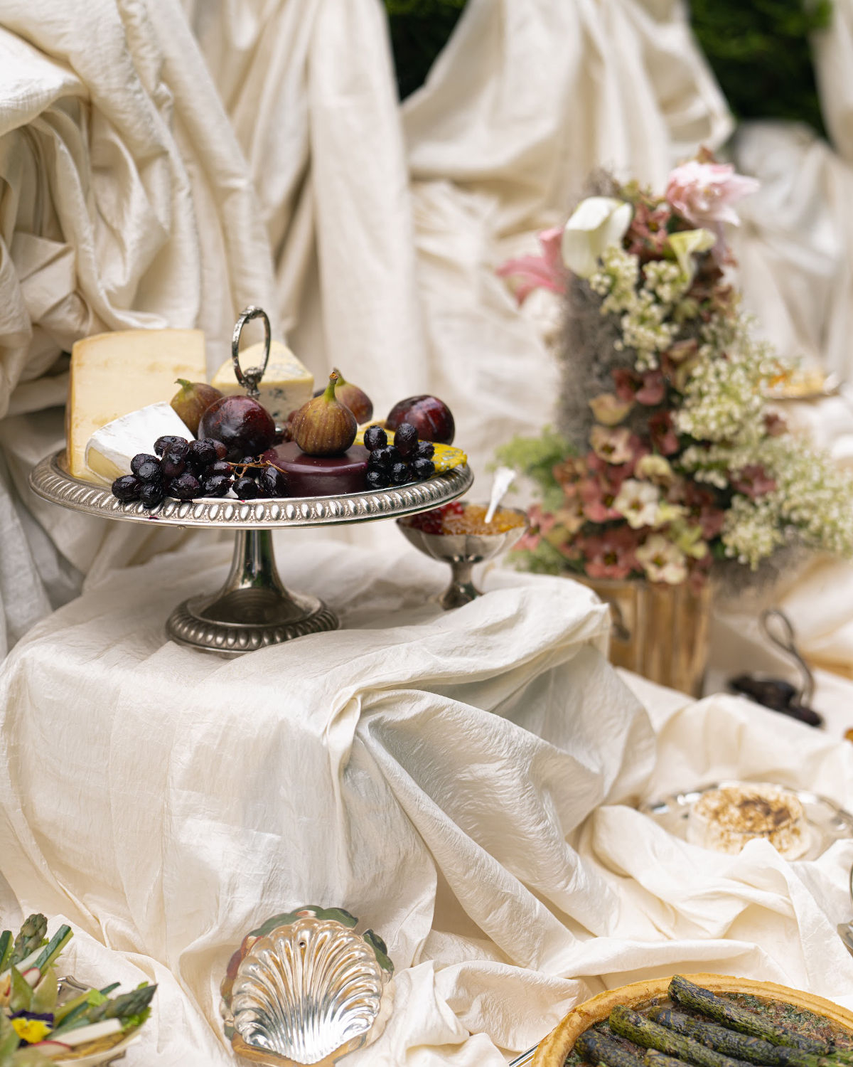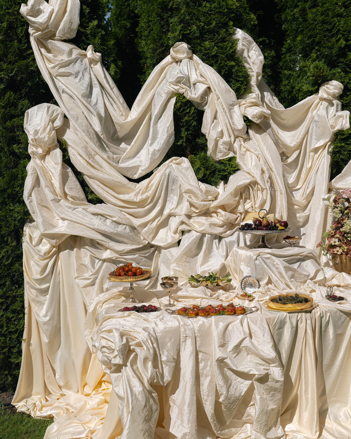 The design speaks in a language of form and feeling: artful tablescapes with sculptural silhouettes, fluid drapery installations that lend the space movement and depth, and a spiral dinner table that unfolds as a cinematic gesture of togetherness. A muted, intentionally refined palette underscores it all, allowing the couple’s emotions to remain the truest focal point.