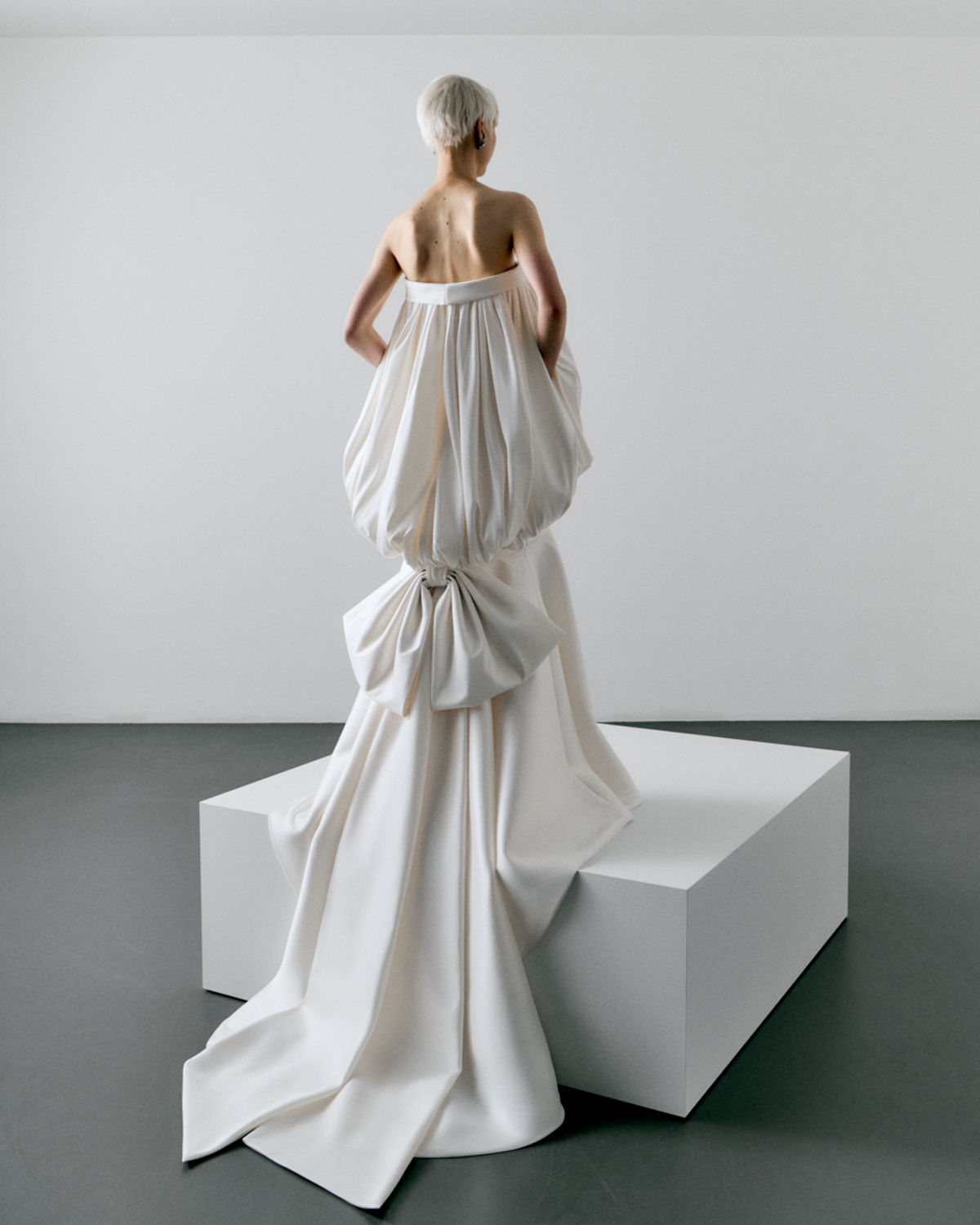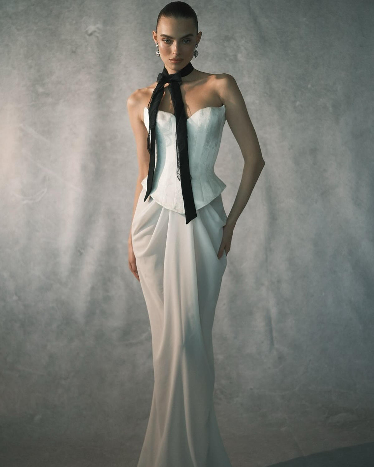 The Glamoratti trend introduces a new language for bridal—precise, elevated, and unapologetically bold. Sleek tailoring meets statement structure, with gowns and suits that sculpt the body in clean, commanding lines. Pinterest sees Gen Z and Millennials gravitating toward strong silhouettes and oversized accessories. It’s a take on power femininity that nods to the decades past but feels entirely of the moment.