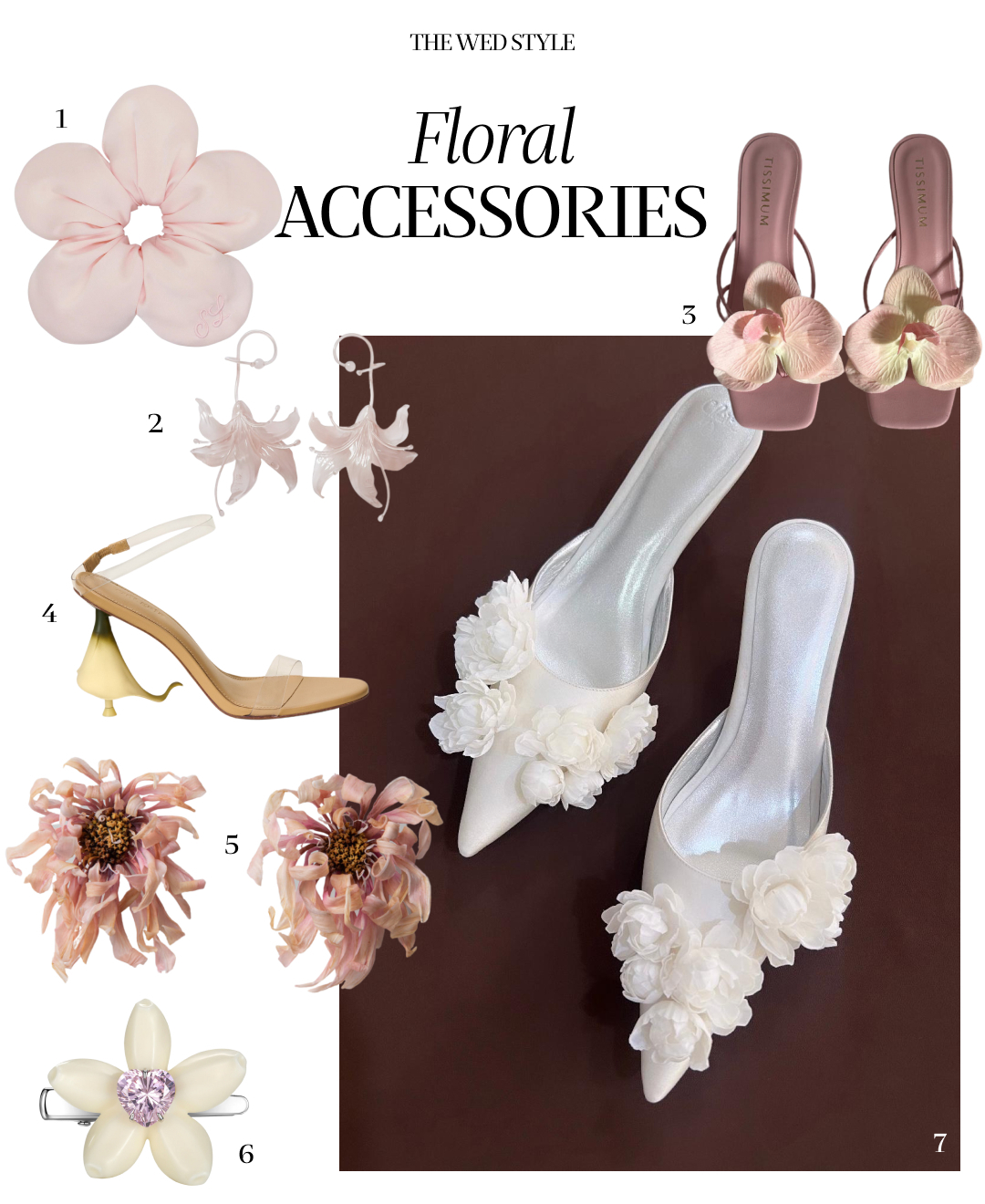 To create a cohesive wedding look with floral accessories, focus on a balanced and elegant combination of floral motifs. Complement these with more subtle accessories that complement the theme but don't overwhelm it – for example, delicate floral bracelets or simple floral pumps. To tie everything together, add small floral accents to your hair, such as a few fresh flowers or a floral headpiece, and make sure your bouquet decor elements match your accessories.