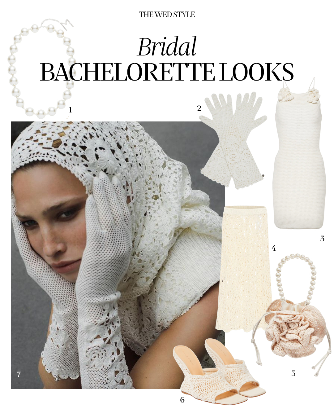 For a chic, vintage inspired at your bachelorette party, try a full ivory crochet look. Start with a white dress or suit featuring delicate crochet detailing, or go for a full ivory crochet set with a hint of biege for contrast. The light, breathable textures of crochet offer an summery, laid-back feel perfect for daytime or beachy celebrations.