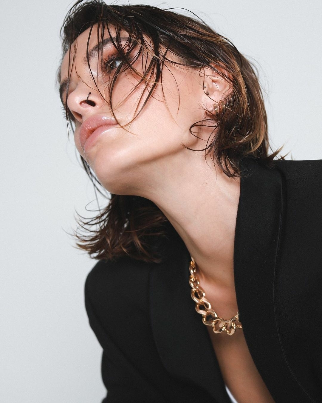 Here are a couple of tips to make it simple: wet your hair with water, apply gel (my favorite one is R+Co Motorcycle), and spread it through your hair with a comb. Using water first will reduce gel consumption and speed up the process. You can also blow-dry your hair with a hairdryer, combing it in the right direction for a long-lasting result. If you want a lighter effect, you can use a hair mousse (for example R+Co Aircraft) and hair dryer. You can also use R+Co Freeway to fix the result. For those who have a low forehead and a smaller face, this style will work amazingly well for you. But let’s not forget that there are no rules and if you like something, go for it!