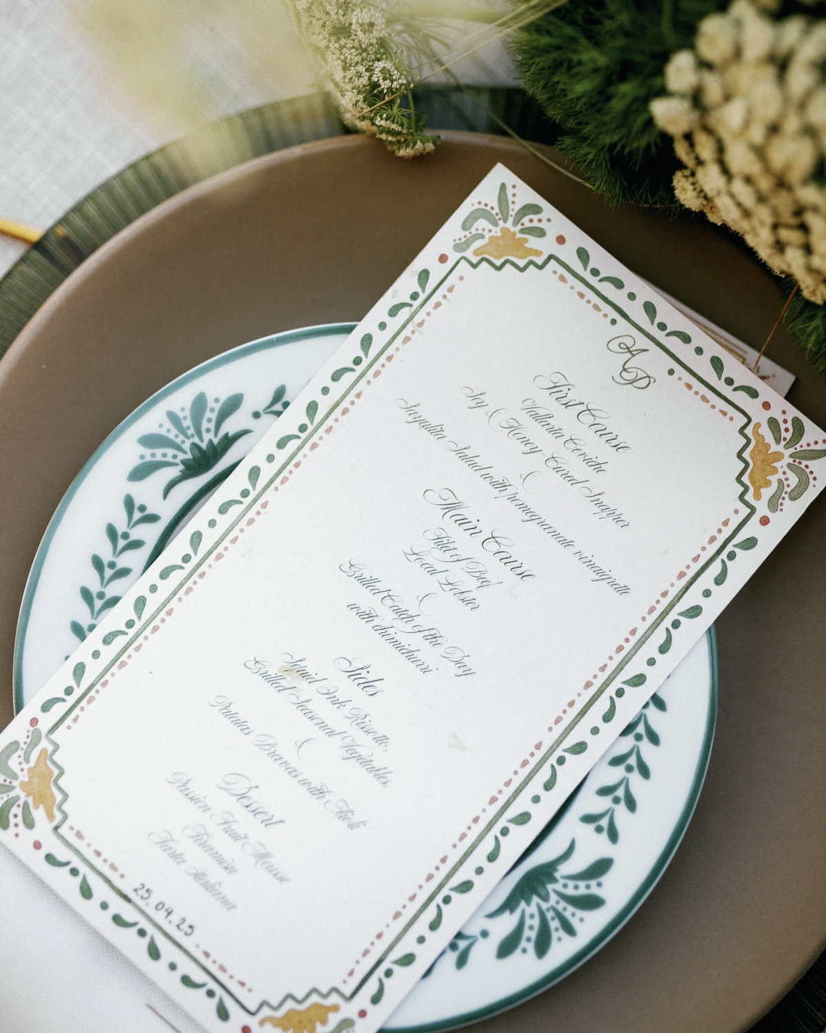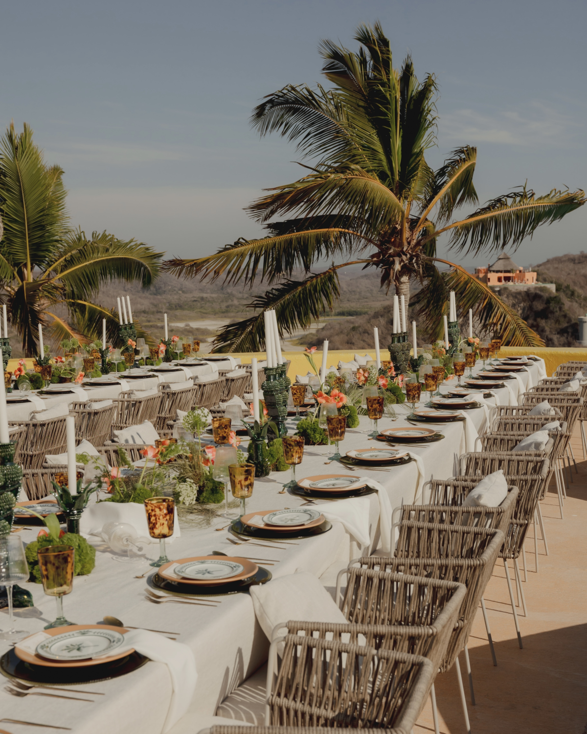 Designing around the villa’s bold yellow architecture was no easy task. I wanted layered, textured tablescapes that evoked the mood of a retro supper club in Havana or Capri. Our florist spent months sourcing deep green Michoacán clay candelabras that I knew would ground the entire design. Rather than relying on lush florals, I let the ceramics do the storytelling: hand-selected plates, vintage-inspired glassware, and custom paper goods gave the tables depth and character. I wanted rich greenery and organic movement, with a single floral moment that could tie it all together. Our florist opened up orange tulips so they looked wild and sculptural—suddenly they became something entirely different. They brought the whole tablescape to life.
