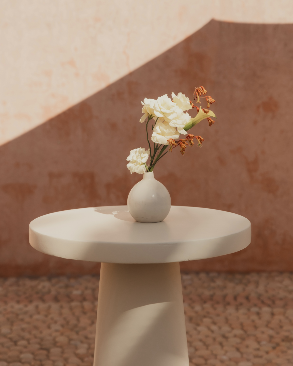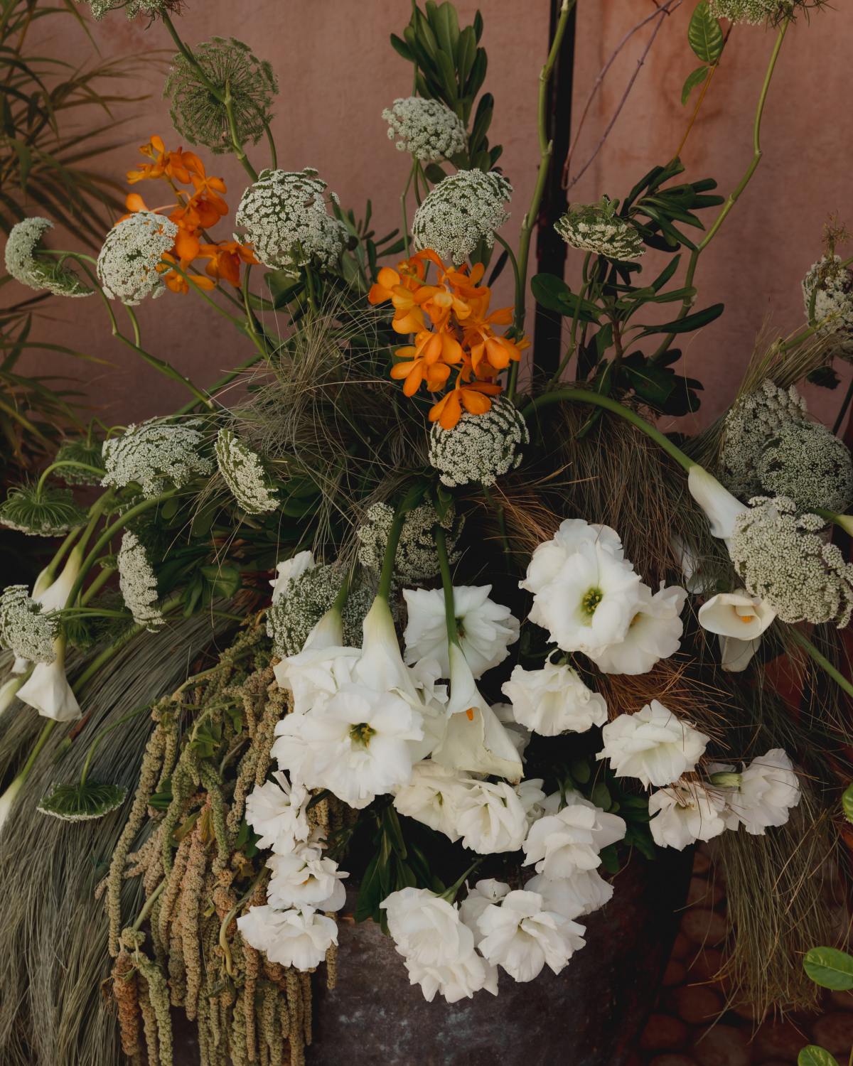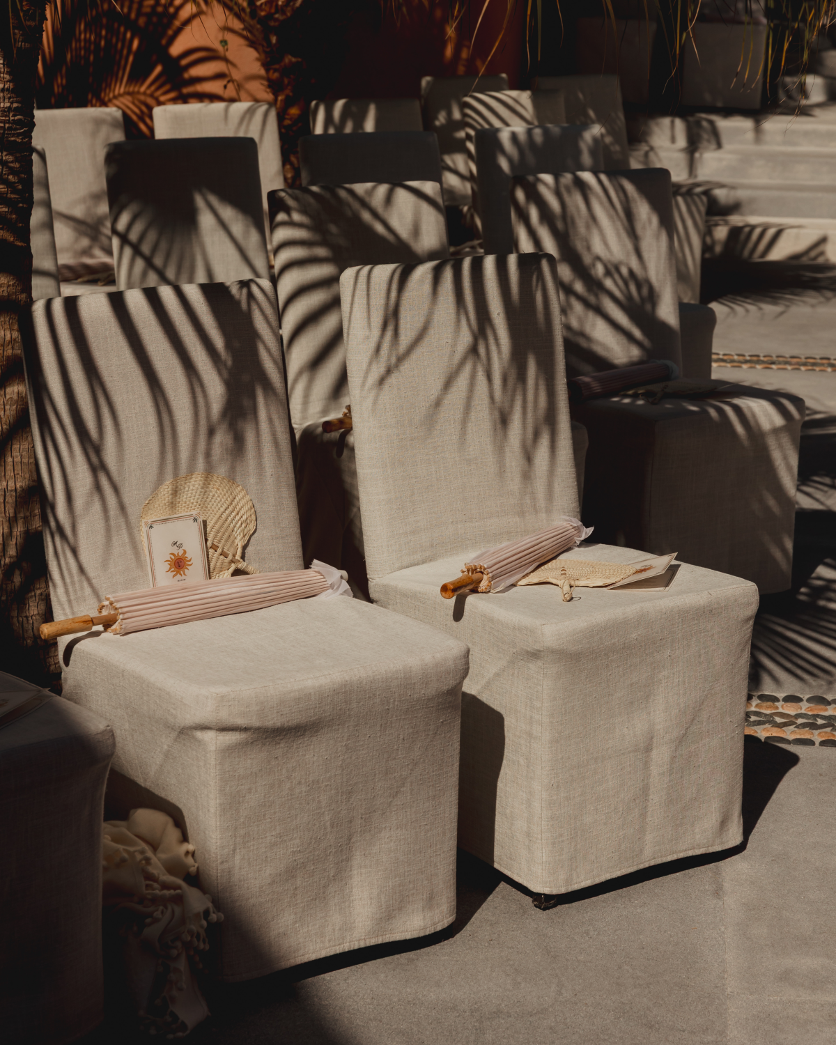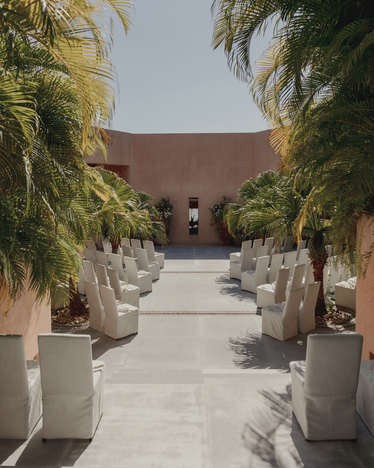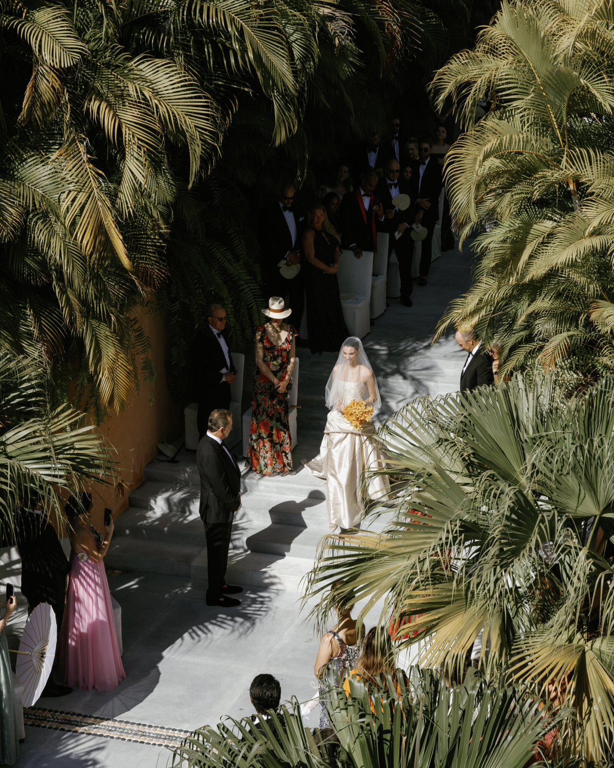 Guests were welcomed at the entrance of the villa with cocktails under large white umbrellas, accompanied by a live band. After about 20 minutes, they were guided down a garden path to the ceremony, held in a courtyard at the front of the villa. Palms shaded the guests, and we incorporated the villa’s existing large ceramic pots and lush plants into our floral design. The band was originally supposed to play a cover of Mystery of Love, but at the last minute, they switched to Margaret by Lana Del Rey—changing the lyrics to include “Aliett.” I didn’t even realize it until my friends sent me videos the next day.