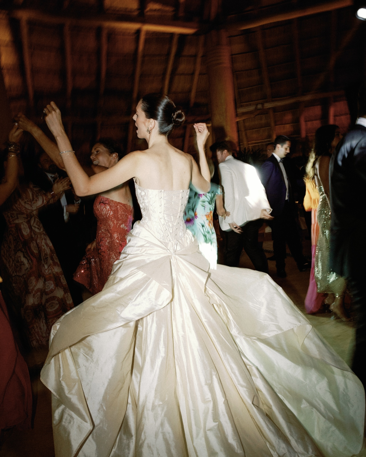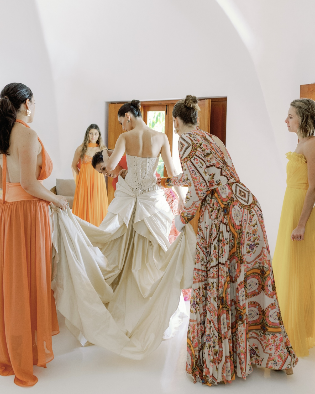 Parke gifted his nine groomsmen custom slippers monogrammed with their initials. I didn’t plan to have an official bridal party, but my closest girlfriends serendipitously arrived in shades of orange, yellow, and pink—echoing the vibrant villas of Careyes. My maid of honor wore vintage Etro, and my mom wore a custom Silvia Tschersi gown.