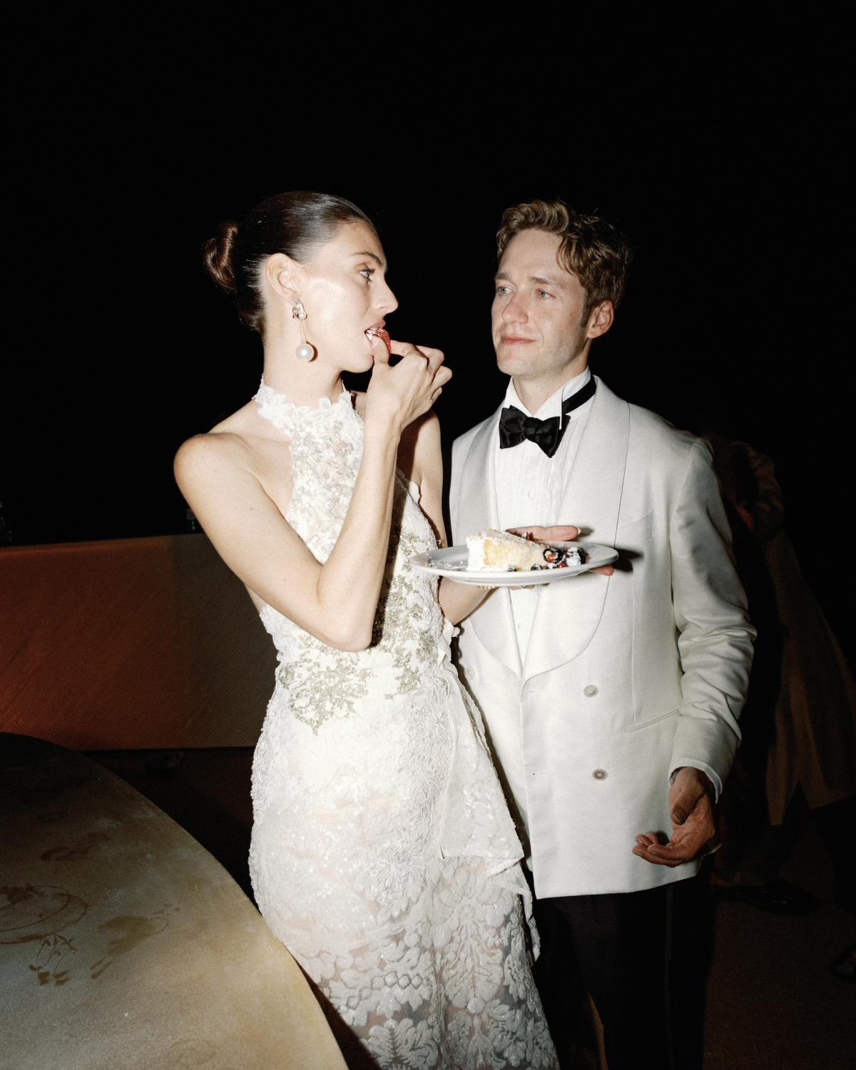 For the after-party, I wore a custom lace dress by Kristin Mallison made from lace from my mother’s wedding gown. My jewelry was entirely vintage, sourced from my favorite estate jeweler in West Palm Beach. Shoes were the biggest challenge—my dress was a soft champagne tone, not bright white. Just two weeks before the wedding, I found the perfect pair: vintage 1990s Manolos in beige textured leather, adorned with teardrop pearls—from a little shop around the corner from my apartment. Meant to be.