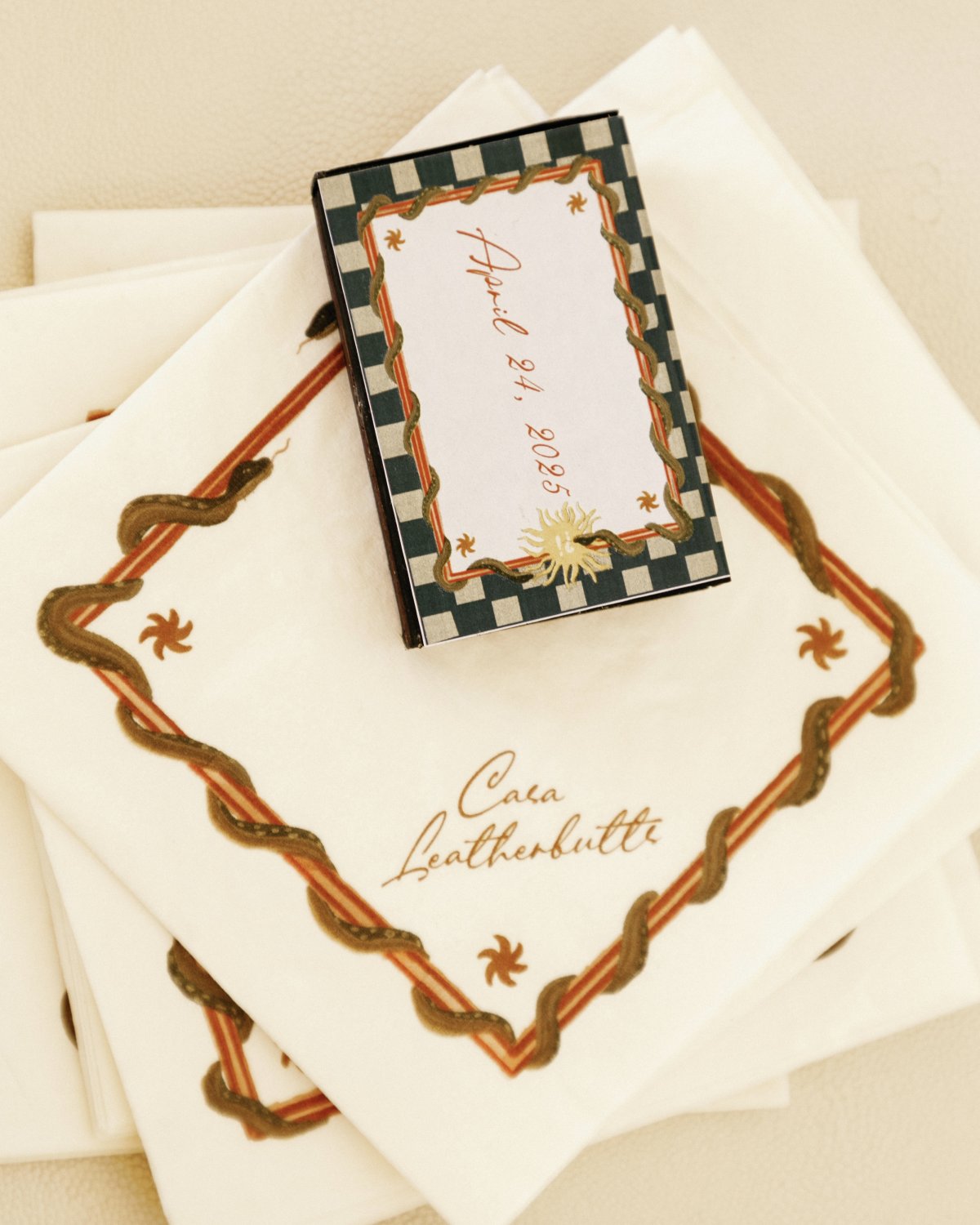 My college roommate, who’s designed for both of my beauty brands—Fazit Beauty and LaBruna Skincare—created custom stationery for each wedding event. I sent her over 25 pages of mood boards, and she captured the essence of it all. One of my favorite details: the round bar on the first floor of the cocktail hour venue, centered around a giant palm tree—it felt like The Tropicana Club in Cuba meets The Beverly Hills Hotel in the ’50s and ’60s.