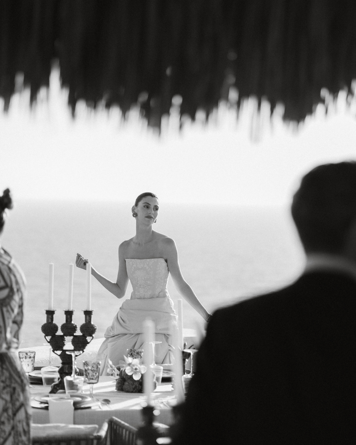 As the sun dipped low, guests were led to a villa framed by bold yellow architecture, and a sweeping view of the ocean. There, textured tablescapes came to life, layered with vintage-inspired details. The floral arrangements featured orange tulips that were opened until they looked wild and sculptural. And the bride? She floated through it all in a custom Annie’s Ibiza look. Designed over months, it echoed the sculptural forms of the venue and felt undeniably, perfectly like her.
