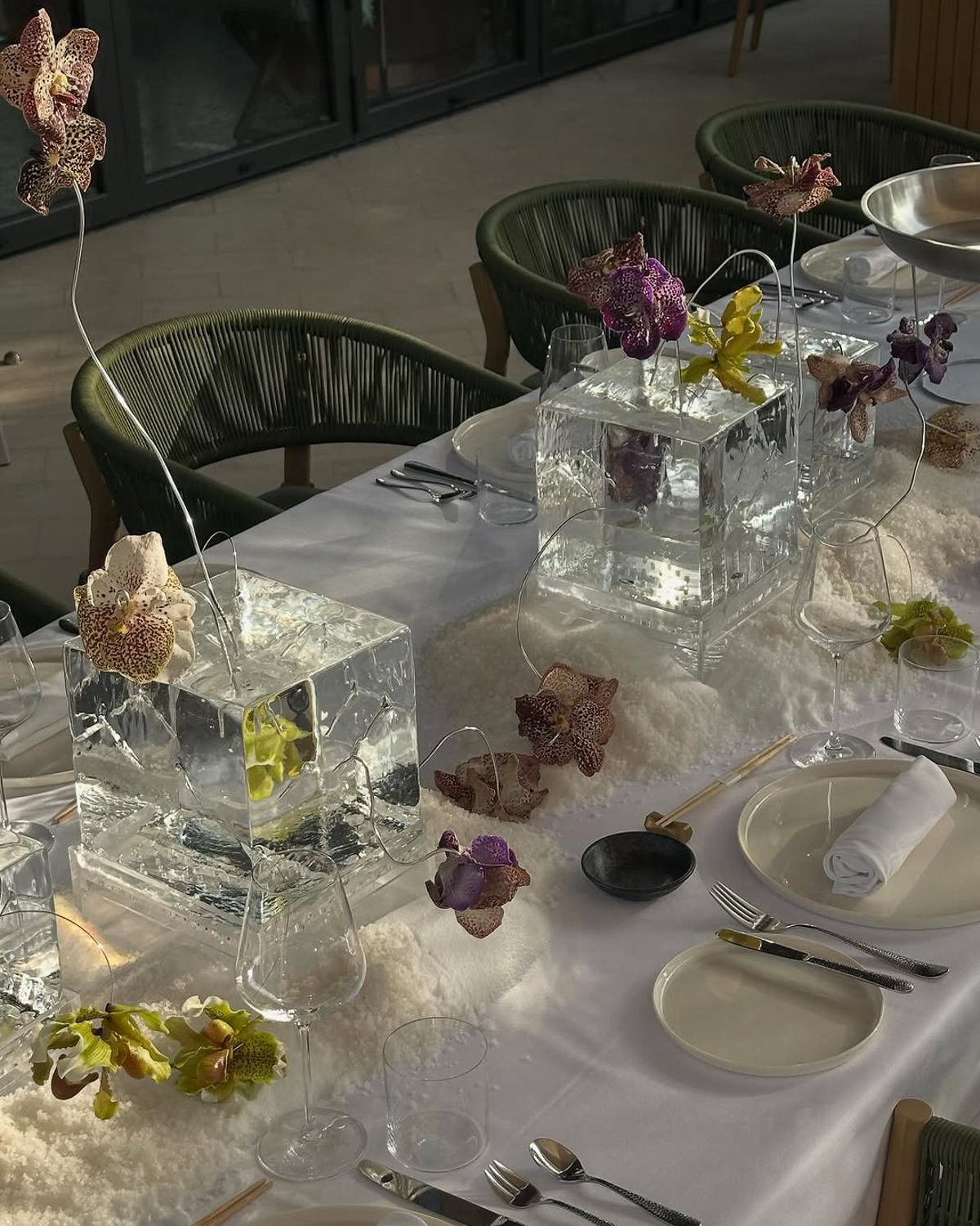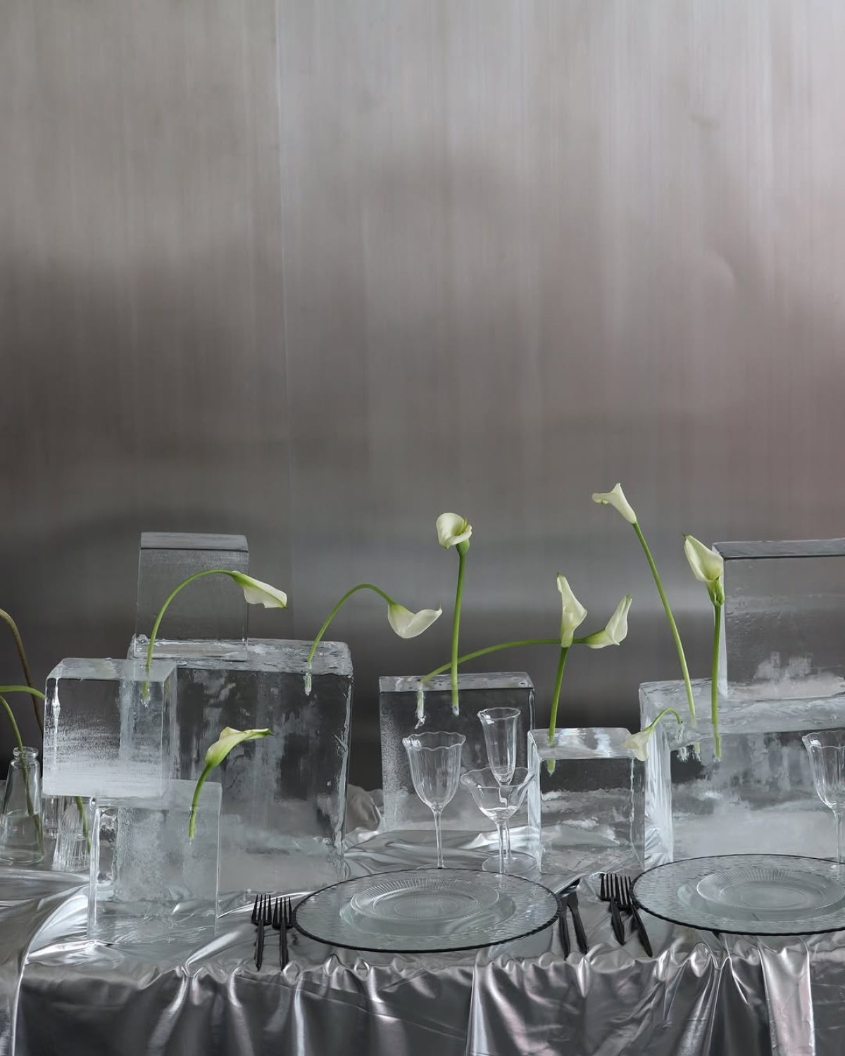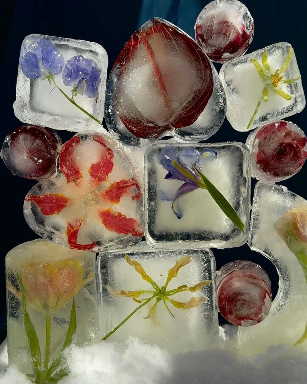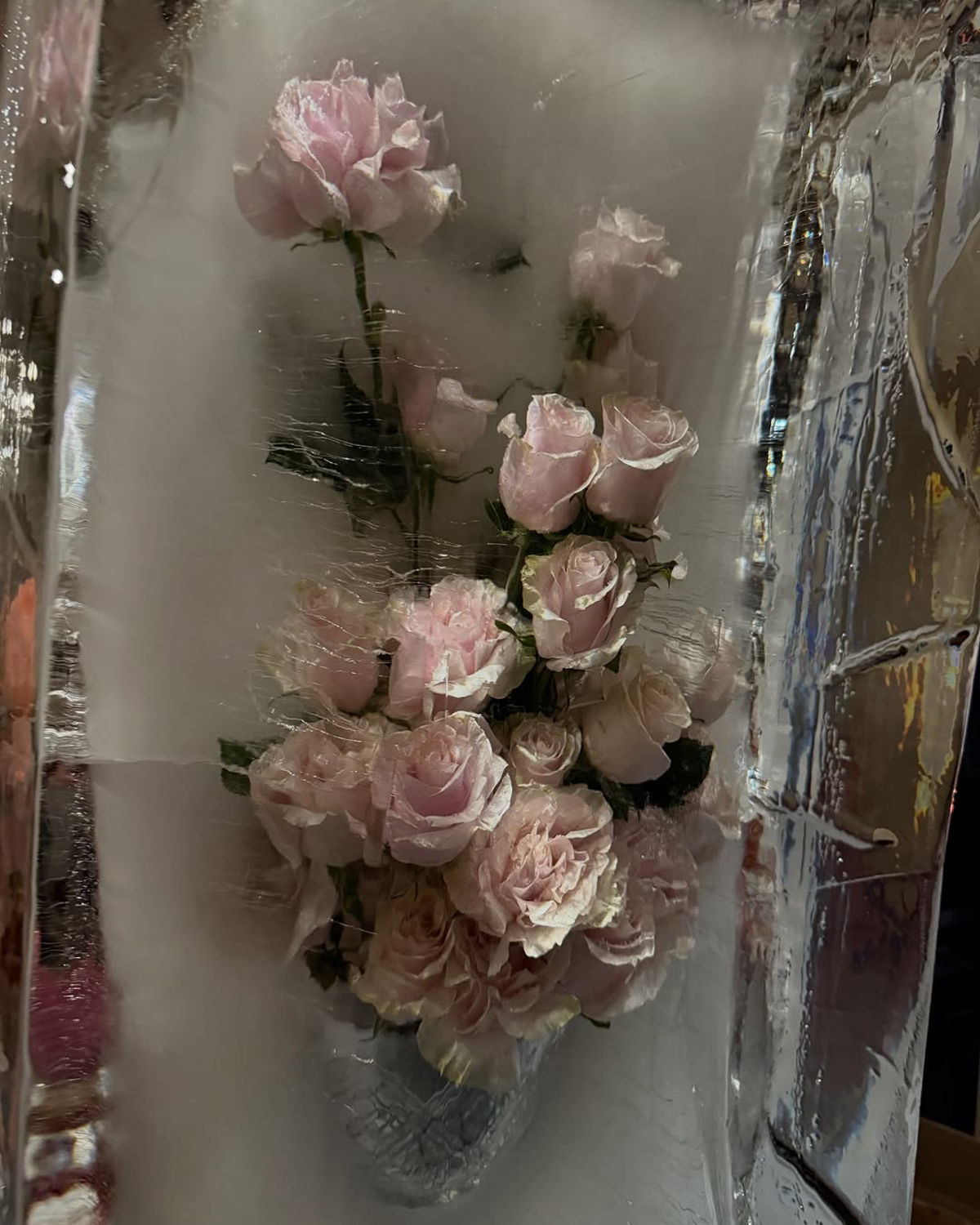 The coolest floral trend we’re currently obsessing over? Frozen florals. These winter-inspired botanical creations are transforming tablescapes and ceremony spaces into sculptural dreamscapes. Think delicate blooms suspended inside crystal-clear ice cubes adorning a reception table or standing tall as statement blocks, glowing like modern altarpieces. Insanely poetic and romantic, the trend captures flowers at their most fleeting and holds them perfectly still.