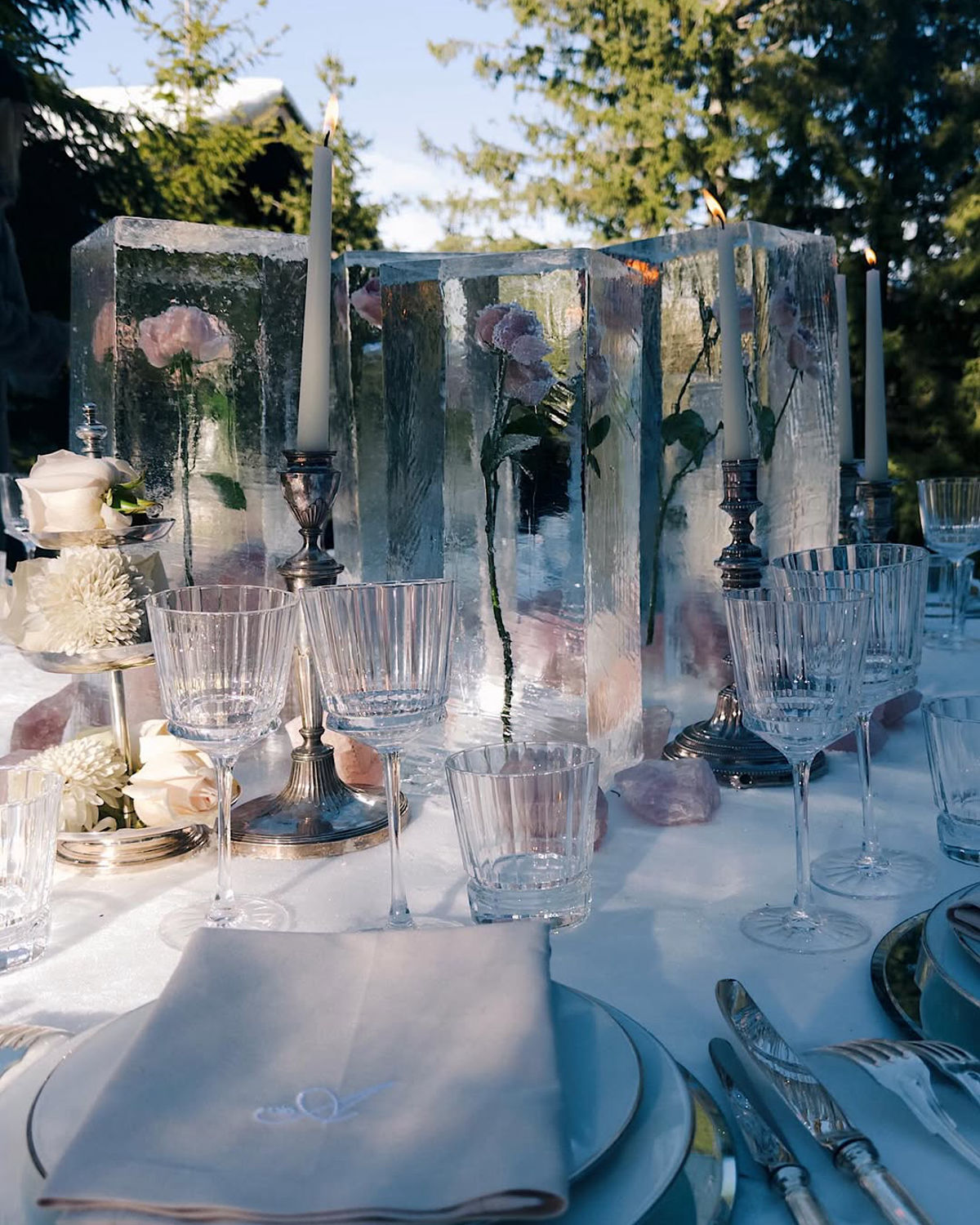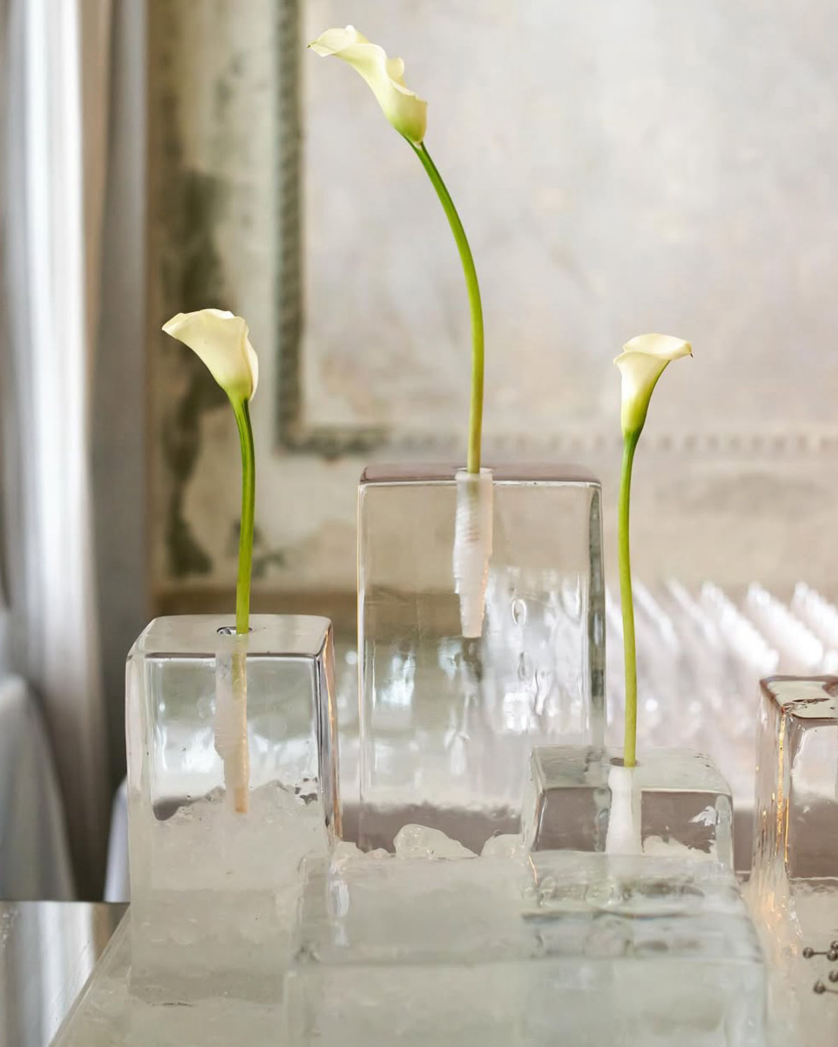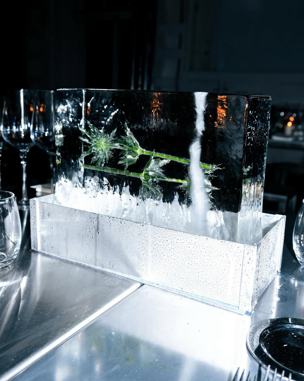 The coolest floral trend we’re currently obsessing over? Frozen florals. These winter-inspired botanical creations are transforming tablescapes and ceremony spaces into sculptural dreamscapes. Think delicate blooms suspended inside crystal-clear ice cubes adorning a reception table or standing tall as statement blocks, glowing like modern altarpieces. Insanely poetic and romantic, the trend captures flowers at their most fleeting and holds them perfectly still.