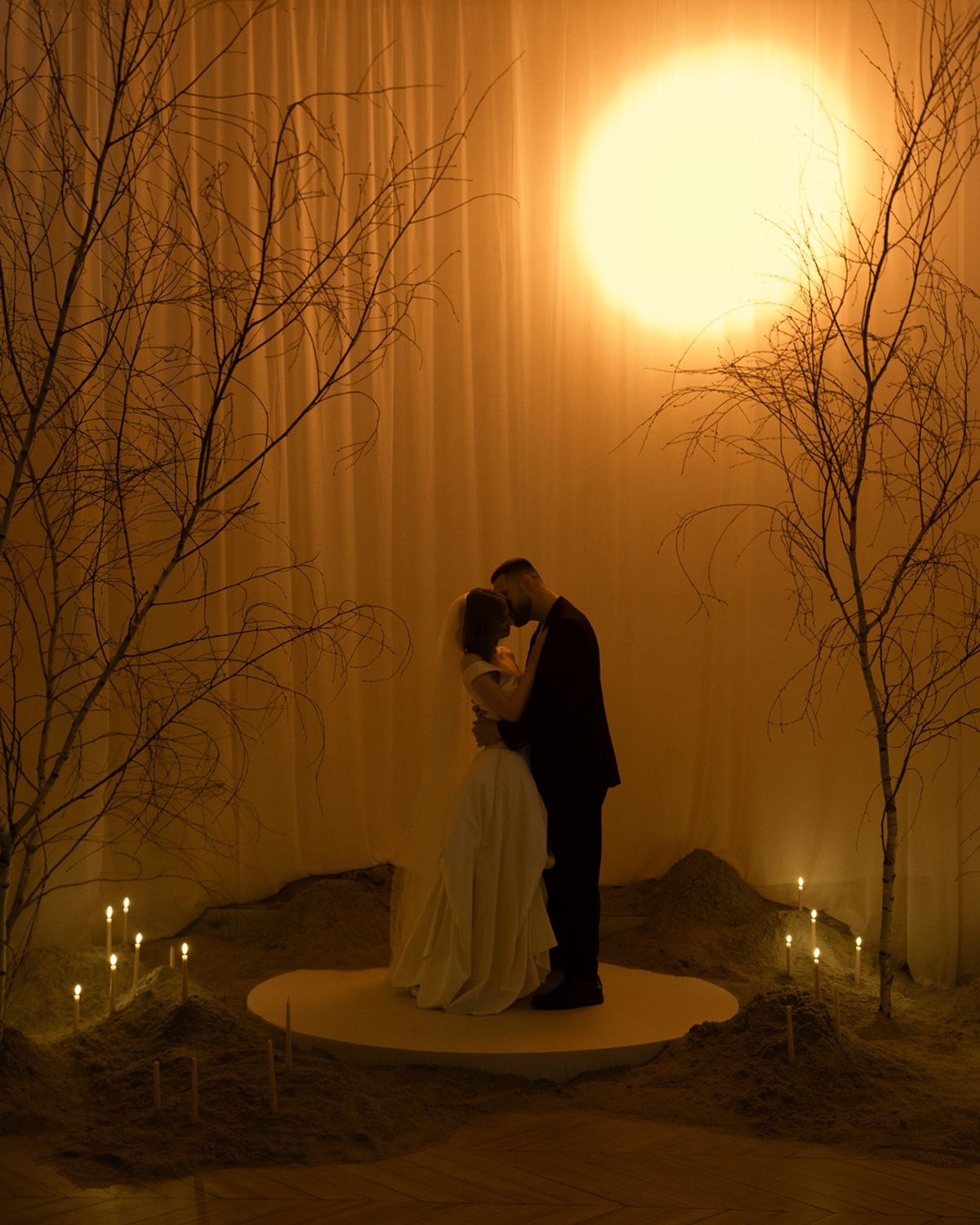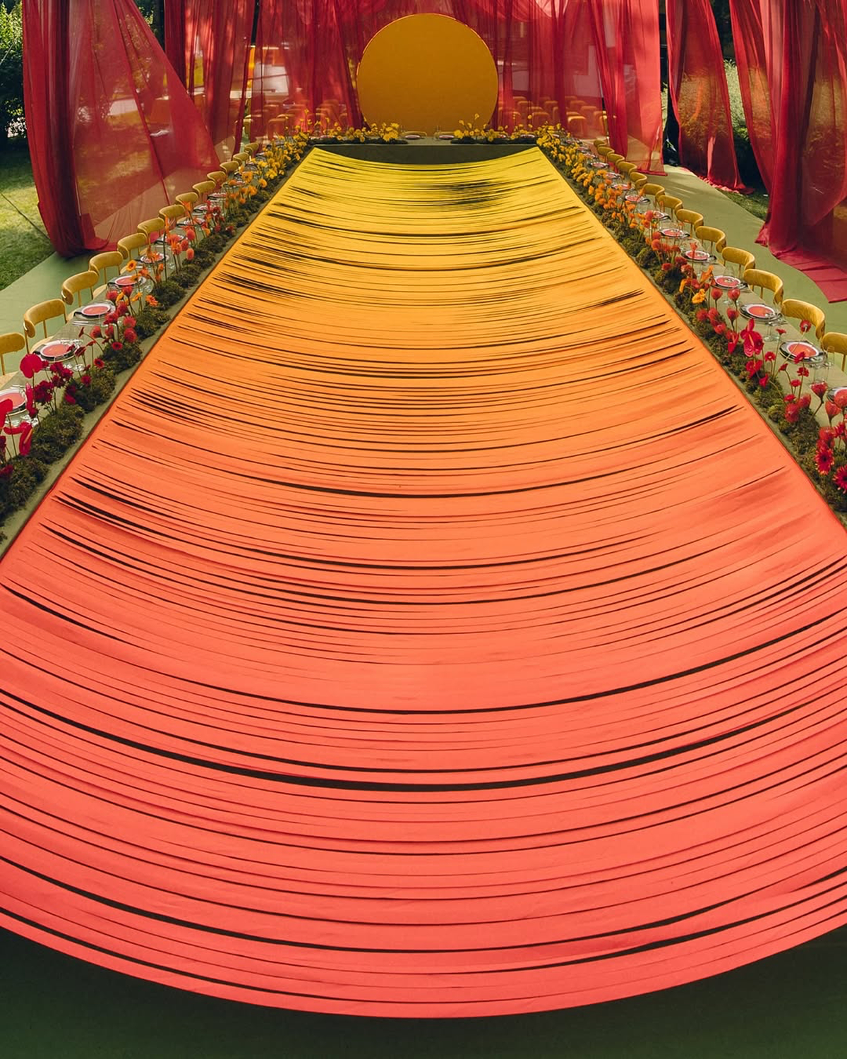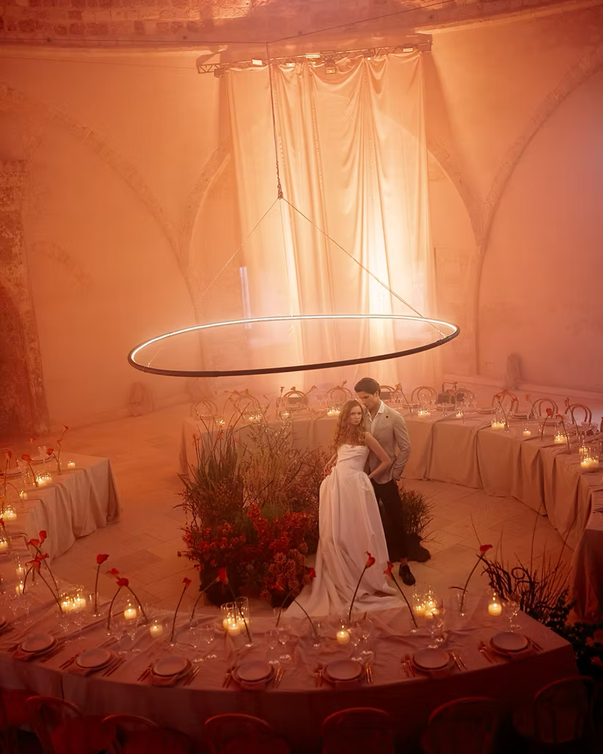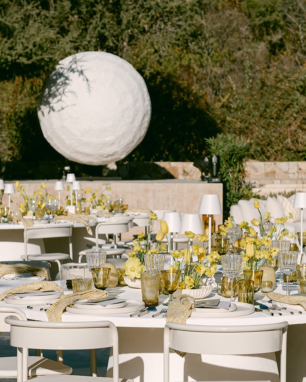 Next stop: Jupiter. Otherwordly solar-inspired wedding design is quickly becoming a standout trend, bringing celestial energy to 2026 weddings. Couples are looking to the stars, incorporating sun and moon motifs across stationery, table settings, and ceremony backdrops, creating a cohesive and stellar theme. Glowing halos of light play a crucial role, with warm, golden tones mimicking radiant sunsets or soft, silvery hues evoking moonlight, enhancing the celestial atmosphere. Or, opt for large-scale planetary installations to serve as a striking focal point, especially for ceremony altars or receptions. It's impactful, immersive, and out of this world.