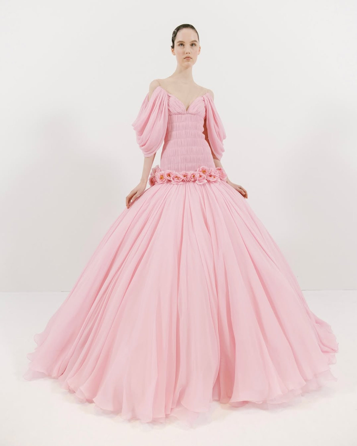A step above blush, petal pink is romantic but grown-up. It hits that sweet spot between soft and striking, especially when paired with clean lines or unexpected cut out details. Think fabric draped silhouettes, sharp tailoring, or textural moments like pleats, organza, or beaded embellishments. Add dainty earrings or a sleek clutch to keep the look feeling modern, yet feminine.
