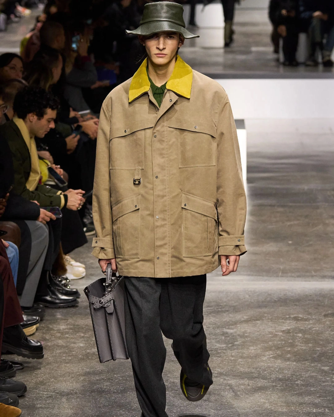 The great outdoors was yet another vivid trend spotted on the runway shows. Leading the way were Miuccia Prada and Raf Simons with their collaborative collection titled "Human Nature." In "Human Nature," the creative duo explores the constant human need to connect with the world surrounding us. At the Prada show, office and nature merged together both in outfits and set design that looked part workspace, part natural oasis. The brand paired classic office uniforms with contrasting, tightly-fitted swimming caps and goggle-like spectacles. The similar outdoorsy feel characterized Fendi’s collection — Silvia Venturini Fendi took it to the countryside: fishermen coats, roomy bermudas, leather Wellingtons, and hiking socks.