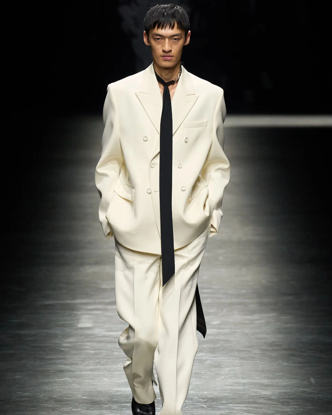 Aside from expected houses like Brunello Cucinelli and Brioni, almost every FW24 collection had at least one take on the classic suit. The ambassadors of sleek suiting and super luxe aesthetics this fashion week were Dolce & Gabbana with their Milan show called "Sleek." The designer duo’s collection was all about elegance and meticulous tailoring but yet with the D&B twist to it. Monochrome, jet-black dinner suits, ties, and pleated cummerbund were the basis of the show. Bespoke tailoring was also the protagonist in S.S. Daley's very Saltburn-ish collection.