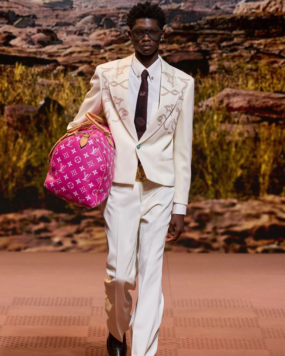 Expect to see lots of cowboy- and dandy-inspired looks this autumn! In the FW24 collection for Louis Vuitton, singer-turned-designer Pharrell Williams offered his interpretation of the American Western wardrobe, and he did it phenomenally. Sandy hues, heavy embroidery, fringes, leather and denim jackets, iconic cowboy boots, hats, and lots of turquoise detailing — the runway transformed into a scene straight out of a high-budget Western film. For accessories and even the soundtrack, LV collaborated with Dakota and Lakota nations, creating a truly immersive and culturally rich fashion experience.
