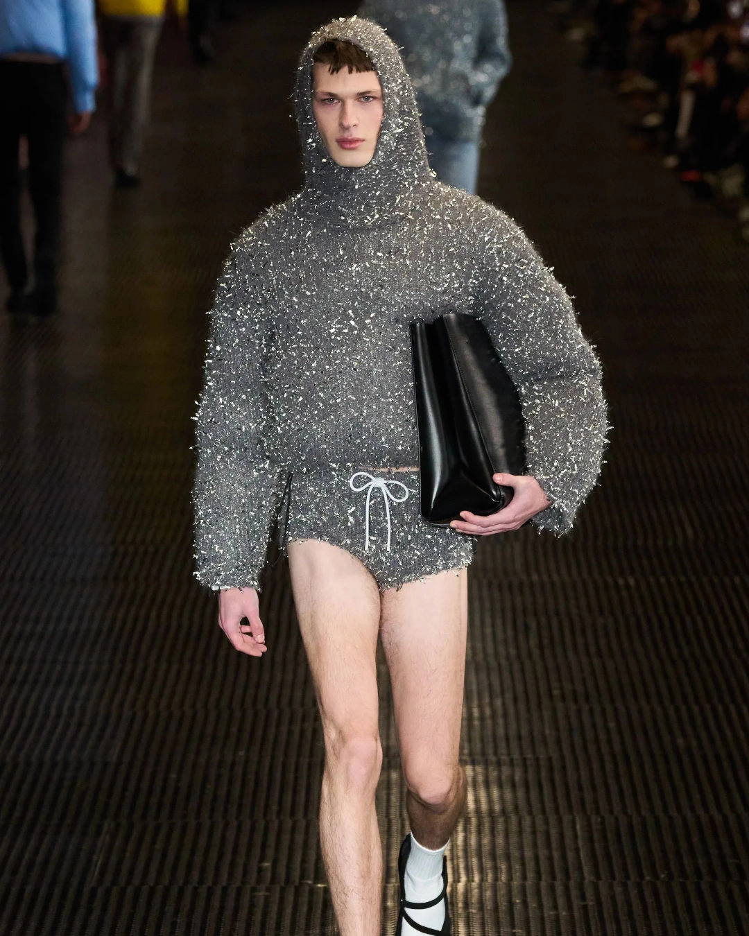 Going pantless was arguably one of the most talked-about trends in women's fashion last year, and now it seems to have made its way into men's fashion too. At JW Anderson’s Eyes Wide Shut-inspired presentation, several male models sported jumpers paired with nothing but sheer black tights. The pantless style also appeared at the S.S. Daley and MSGM shows. The Italian fashion brand seemed to be taking cues from Miu Miu, also dressing their models in shiny briefs.