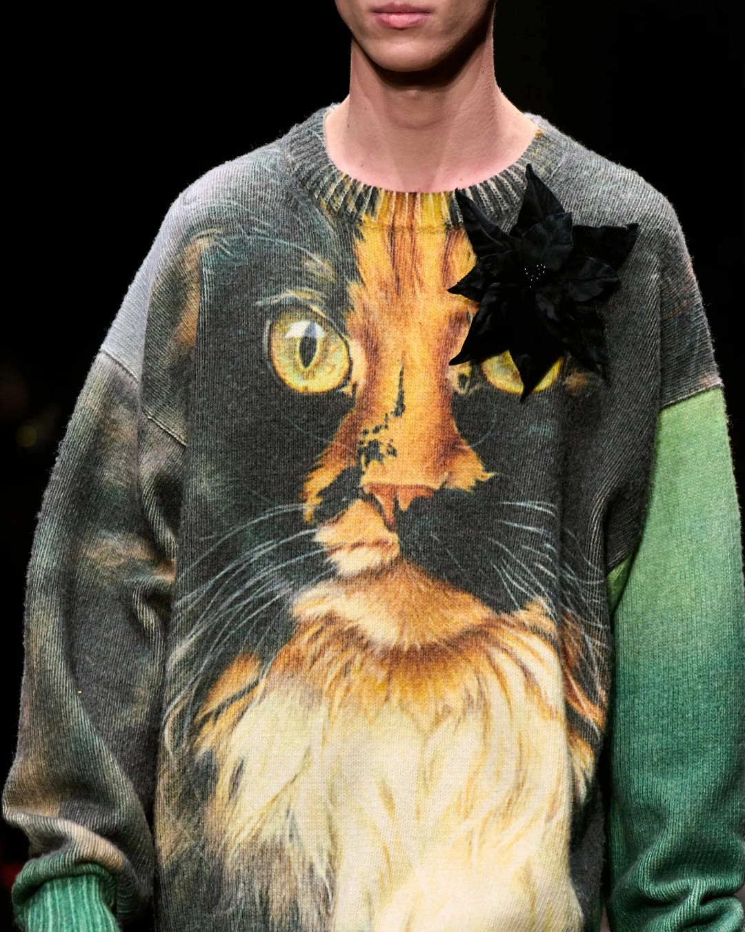 Graphic design took center stage in many collections. At JW Anderson, jumpers and shirt-dresses featured Christine Kubrick’s paintings shown in the Eyes Wide Shut film. Meanwhile, at Loewe, Jonathan Anderson collaborated with artist Richard Hawkins to create a playful yet thought-provoking collection with nods to pop culture. Bold shapes, graphic lines, and screen prints of trains took over MSGM, and human silhouettes appeared on Balmain’s pieces. A popular character across many collections was also the cat. Kubrick’s favorite cat, Polly, looked at us from jumpers and bags at JW Anderson. Feline motifs were also spotted at Acne Studios, Givenchy, Magliano, and Maison Mihara Yasuhiro.