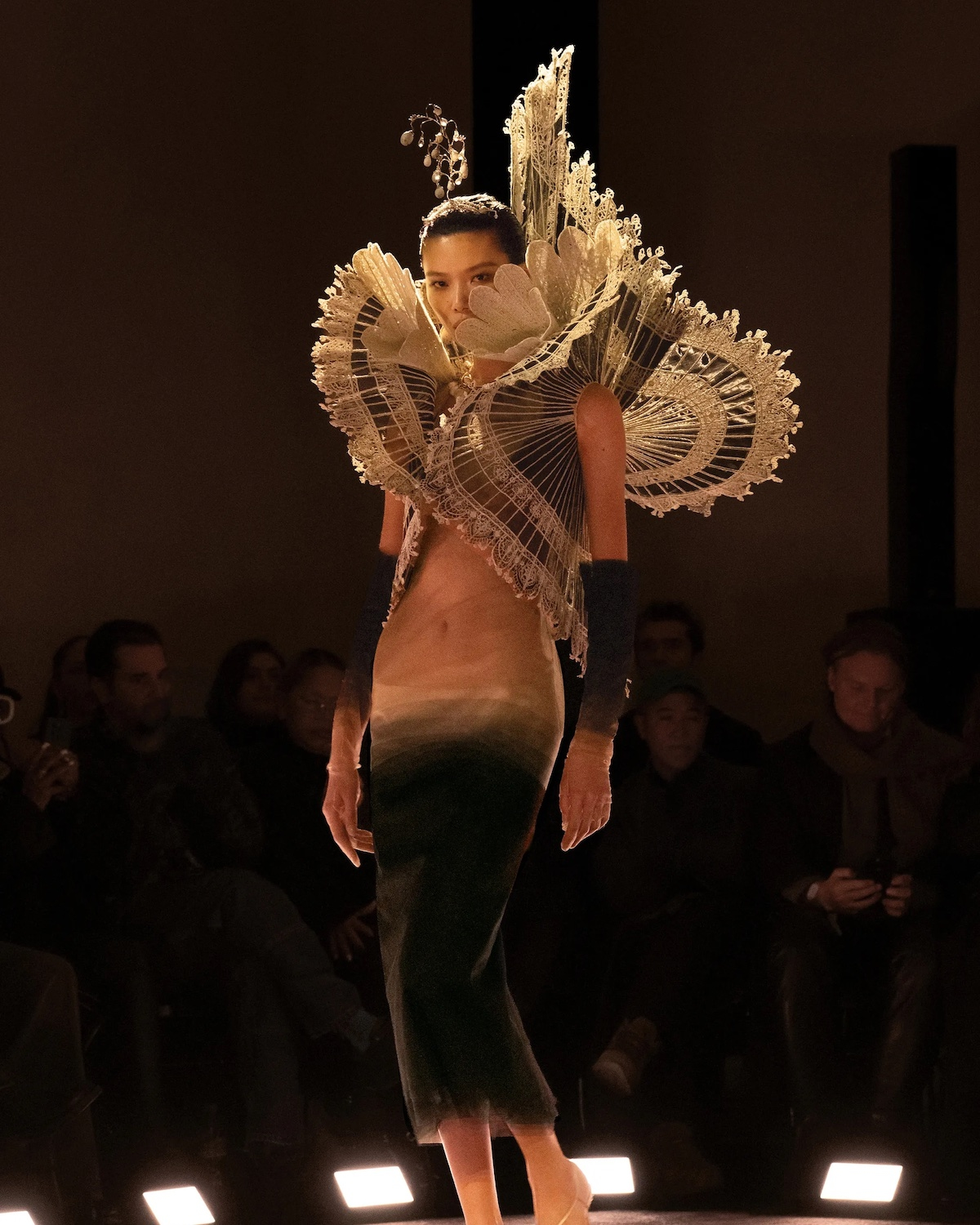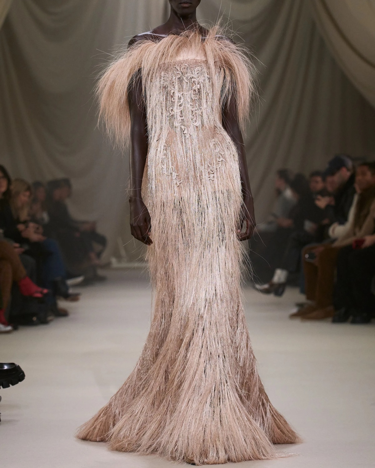 Texture took center stage this season, shifting from surface detail to something far more expressive and tactile. Pearls drifted across sheer fabrics in irregular constellations, fringe and tassels introduced rhythm and movement, and pleats were pushed beyond softness into sculptural, almost architectural forms. Together, these elements transformed couture into something kinetic and dimensional, where garments responded to the body and space rather than simply adorning them.