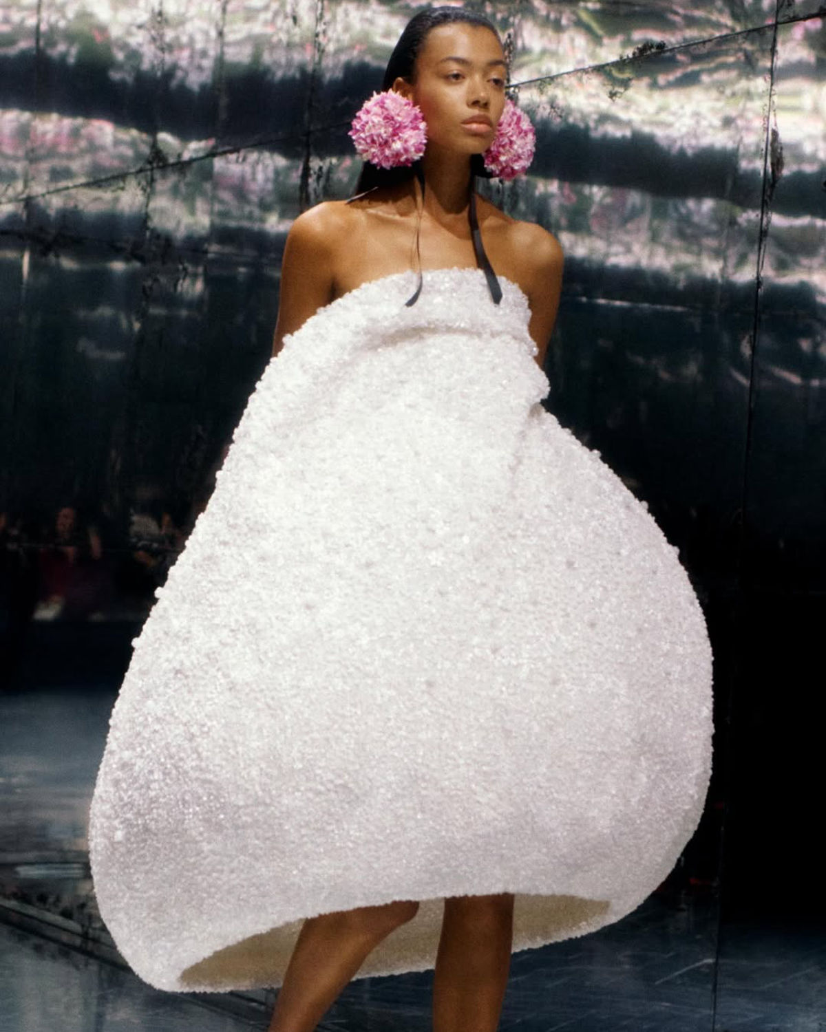 This season, attention shifted decisively downward, with designers letting the hemline carry all the visual impact. Skirts expanded into sculptural forms, swelling, curving, and ballooning into exaggerated shapes that redefined proportion. Streamlined bodices kept the focus clean up top, allowing the drama to billow below, where volume took on an almost gravitational pull.