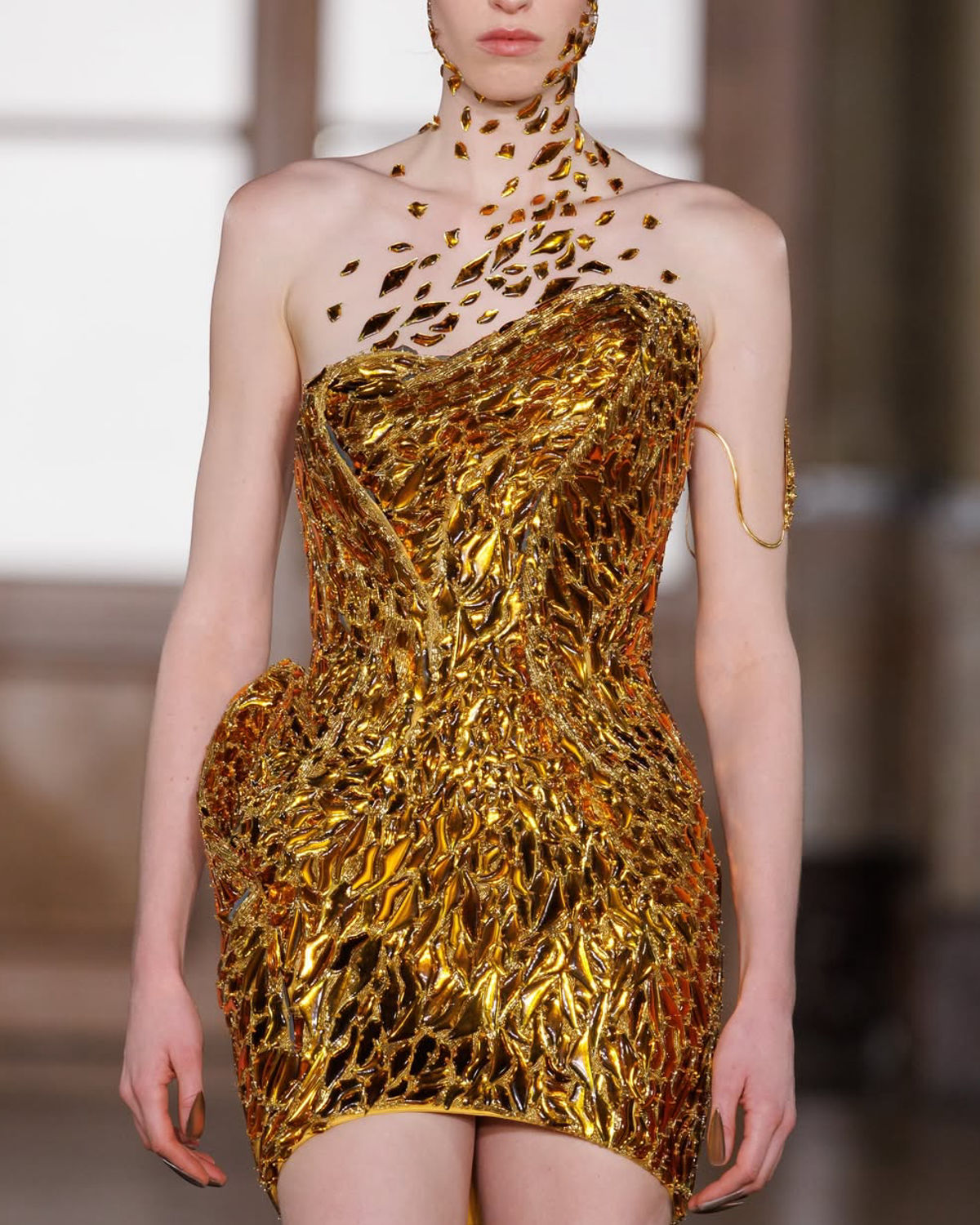 Couture has turned its gaze backward, landing somewhere between the last champagne toast of the 1920s and the first quiet elegance of the 1930s. Dramatic beading, fringe, and liquid metallics skim the body with intention, designed for movement, spectacle, and the soft power of ornamentation. This return to glamour mirrors a wider cultural mood, a desire for beauty, escapism, and craft in moments when the world can feel anything but light.