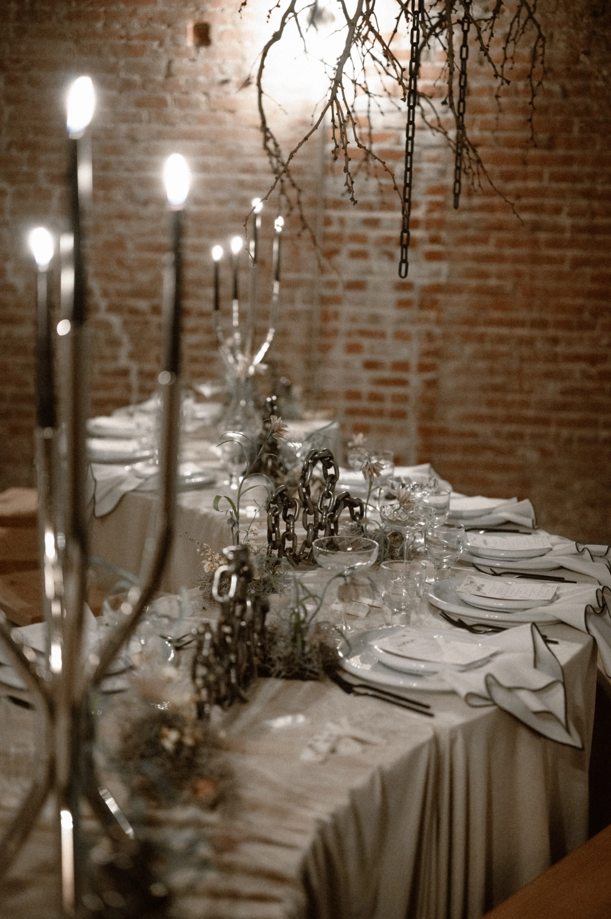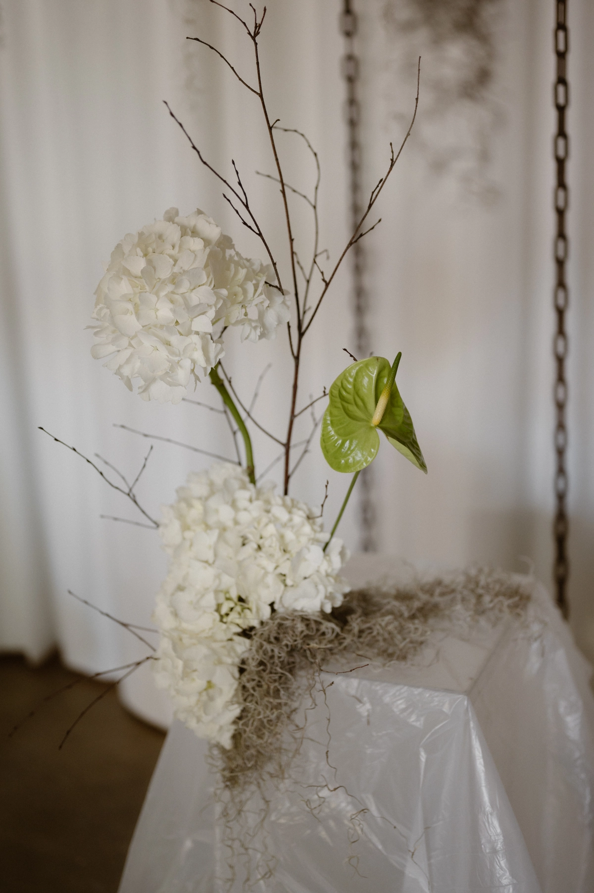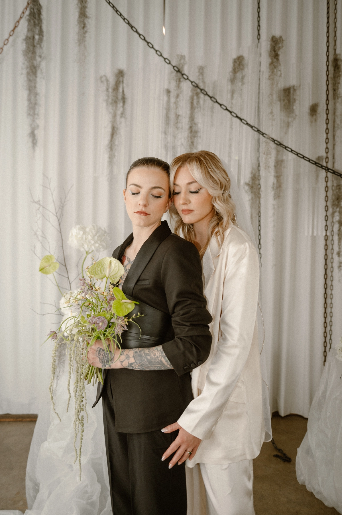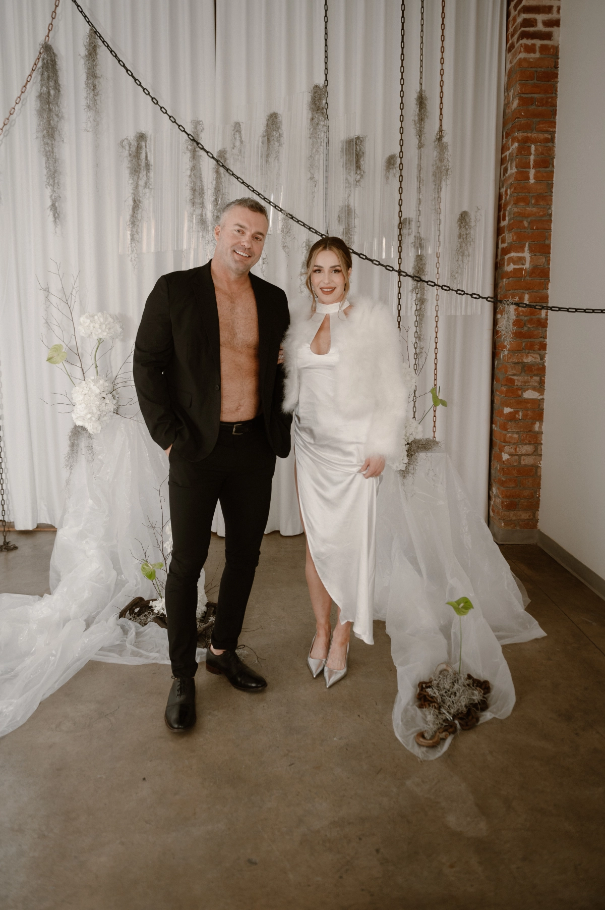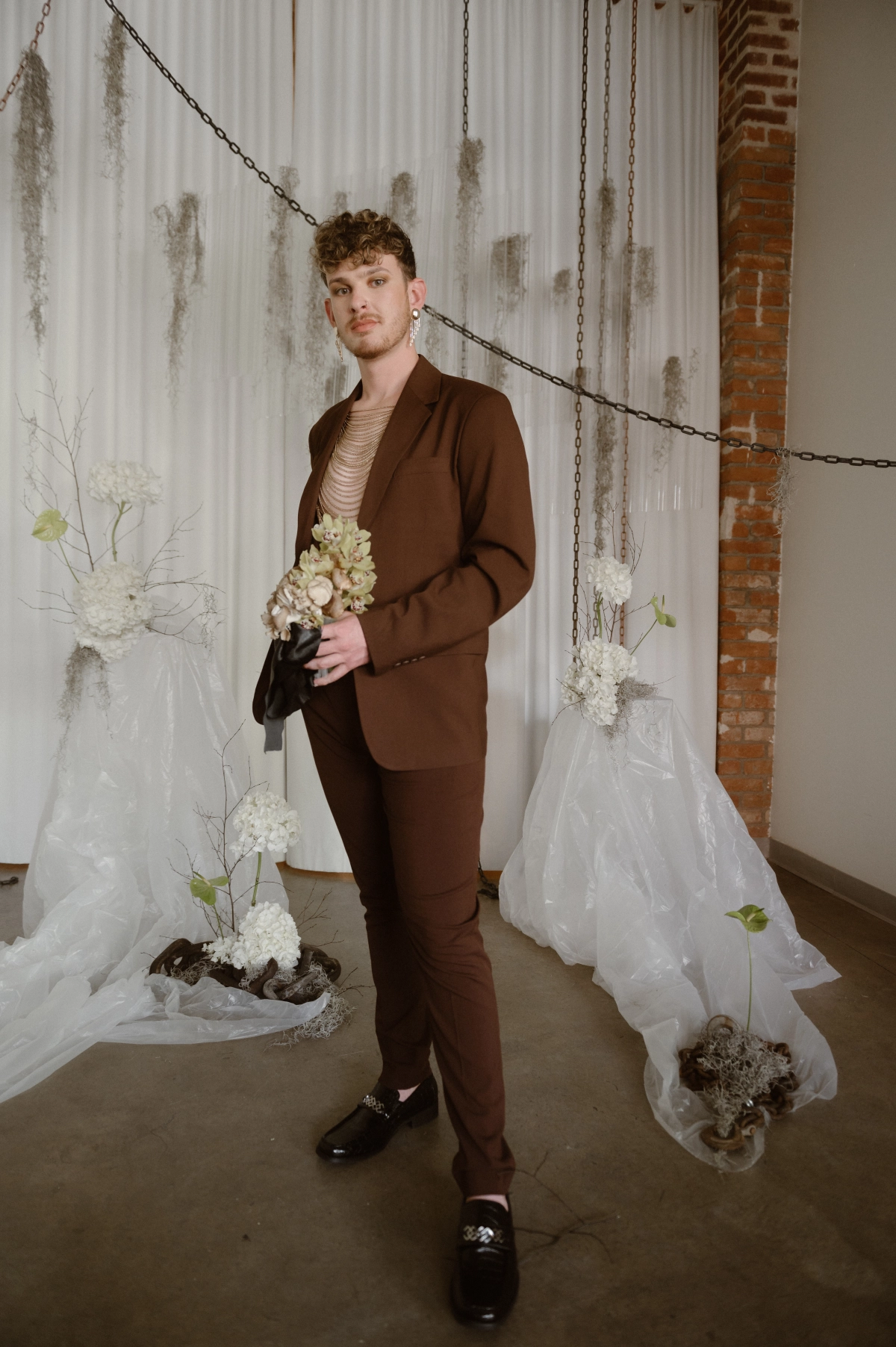 Floor-to-ceiling chains featured in the set design were also used to echo the concept of unity in marriage. They represented both strength and connection, a metaphor that carried itself throughout the entire shoot. To emphasize authenticity, the team utilized materials that felt natural yet refreshingly unconventional.