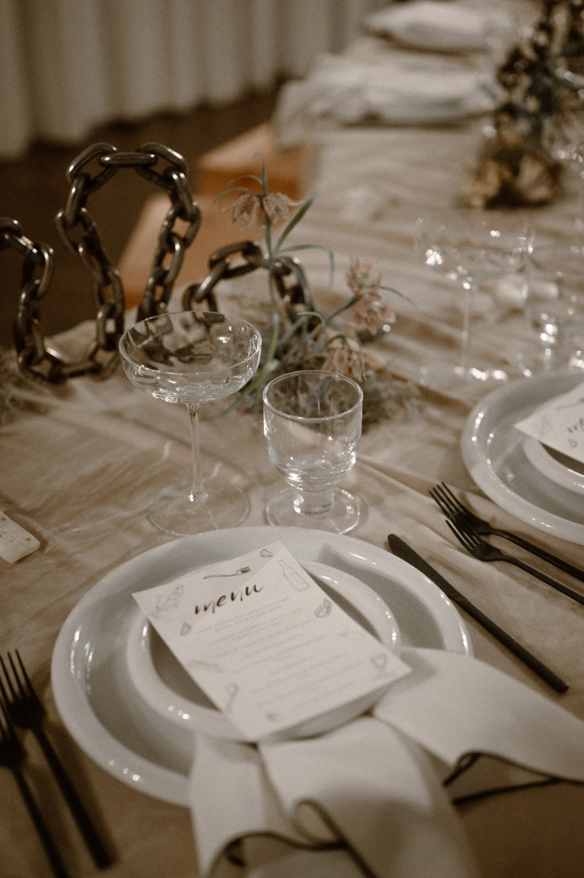 The name, “Unified Connection,” was inspired by Drunk on Design's concept of custom-designed floral conduit welded chains that formed peaks and valleys, an ode to the mountainscapes in New Mexico. This was the focal point on the tablescapes crafted by a local New Mexican artisan welder.