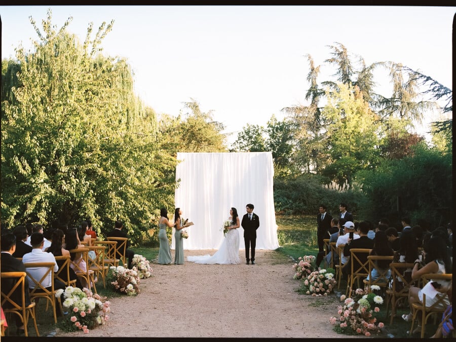 On my way to the altar, I noticed peacocks resting on top of a car, completely unbothered — a small, surreal detail that made me smile. I wasn’t nervous, just calm and eager for everything to begin. The setting was intentionally minimal, with soft white draping and sunlight filtering through the trees, letting nature quietly frame the ceremony.