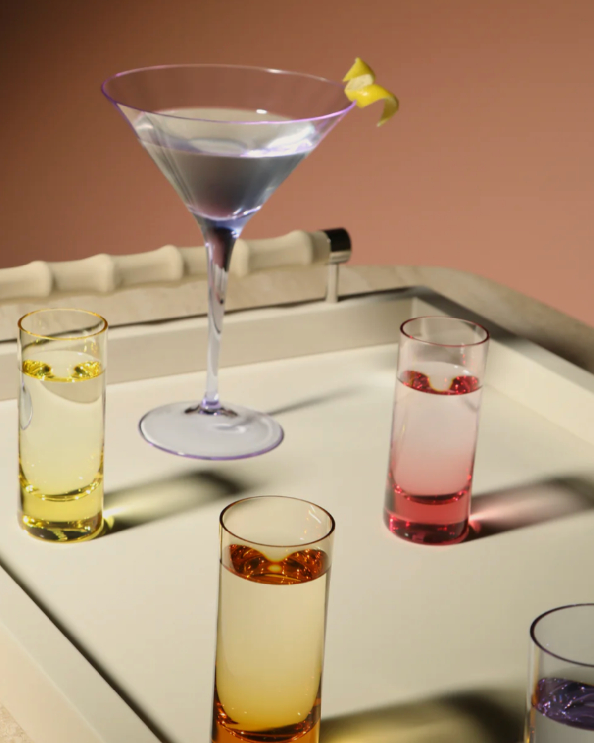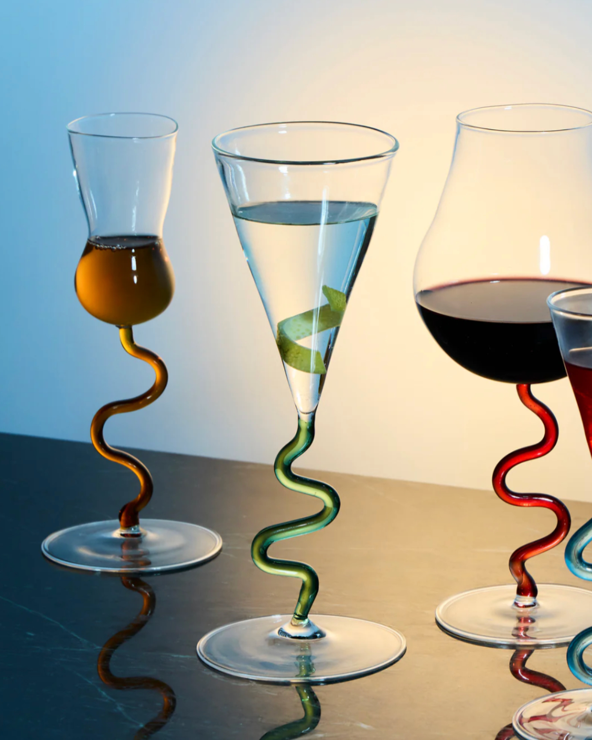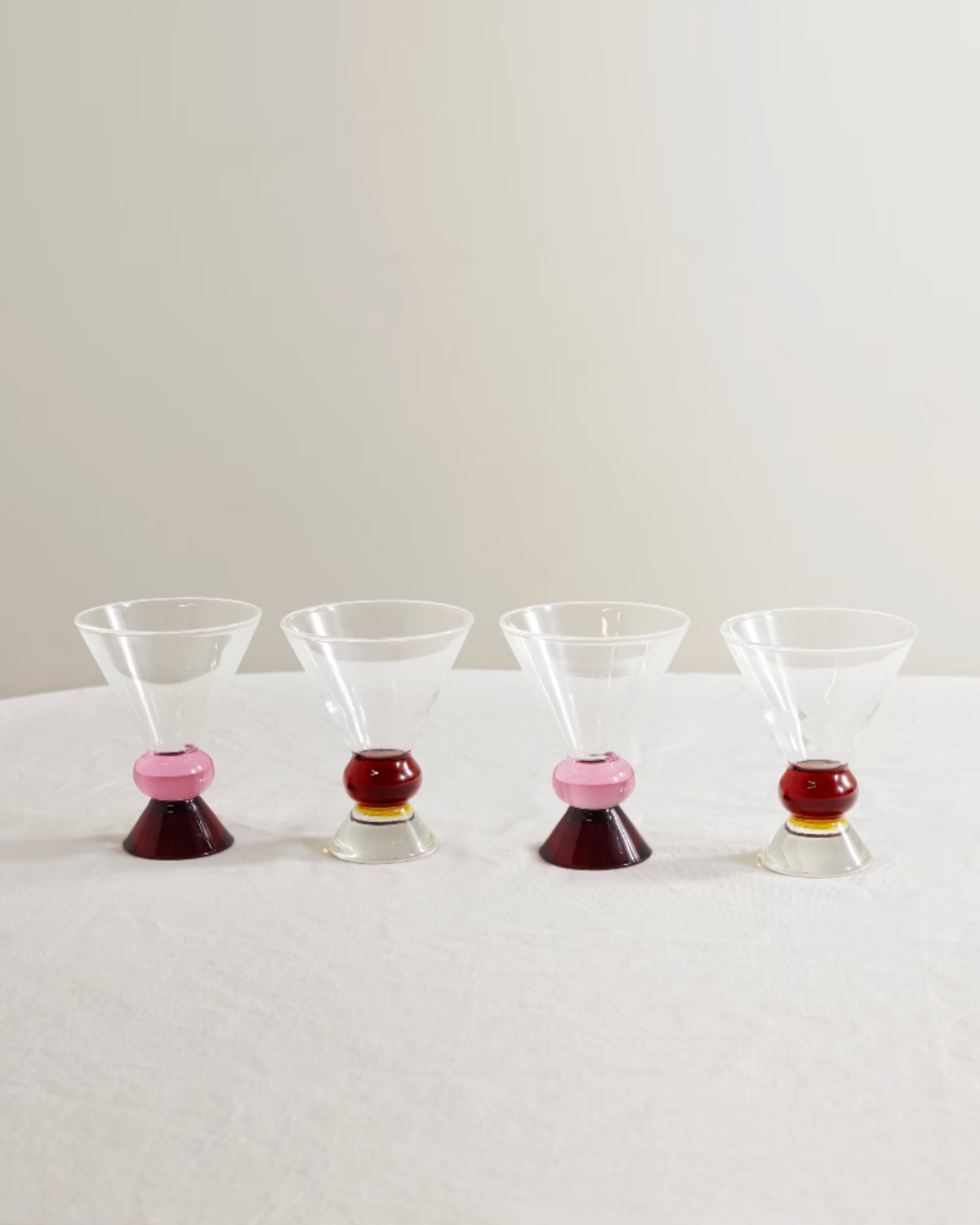 If you like the idea of owning glassware that truly no one else has, Gather is one to know. Based in London, this hot glass studio produces pieces that range from sleek and sculptural to joyfully bold, but what ties them together is that no two are ever exactly alike. Subtle variations in height, color, and detail are part of the charm. Their “Miami” collection is especially fun, with stacked, multi-colored stems that feel almost architectural — champagne flutes that double as conversation starters. These are the kinds of glasses that instantly make a table feel curated rather than coordinated.