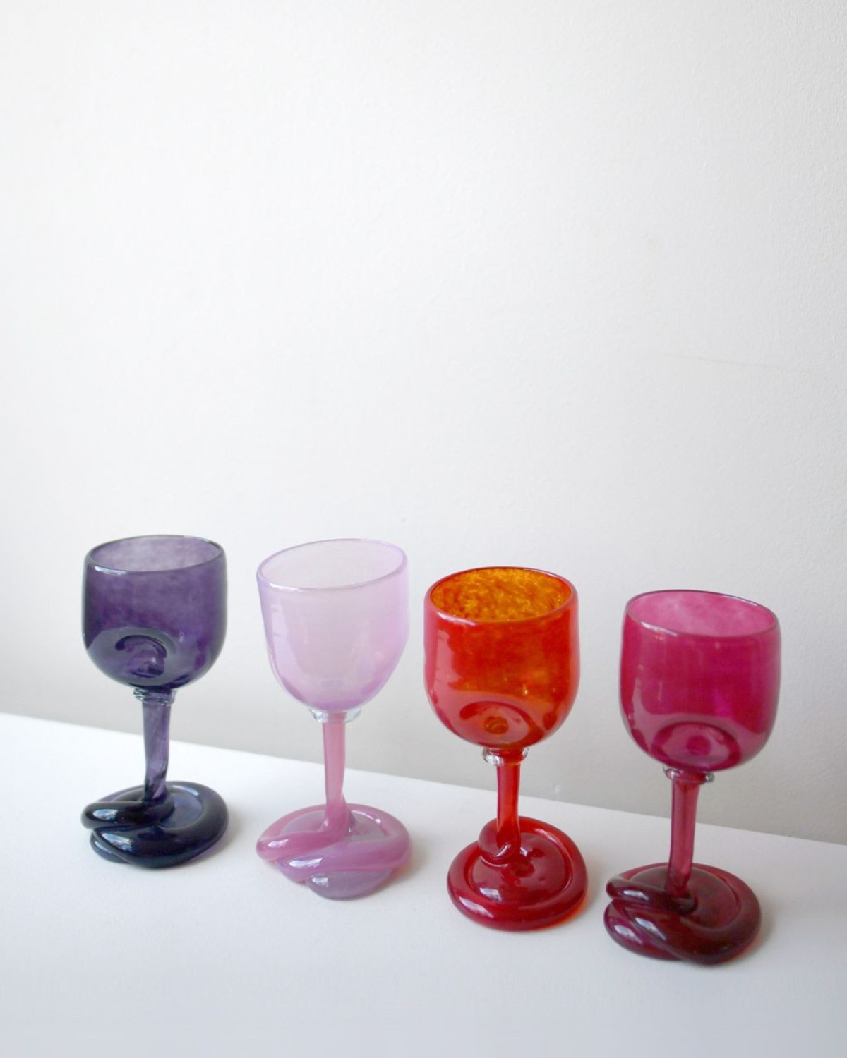 Helle Mardahl’s universe is unapologetically fantastical and Instagrammable. Based in Copenhagen, she creates glossy, candy-colored glass pieces that look almost edible. Her signature forms are curved, bulbous, and slightly surreal, with stems that bend and bowls that feel inflated in the most intentional way. They’re joyful, expressive, and instantly recognizable. If you want your glassware to feel like a design statement rather than an accessory, this is it.