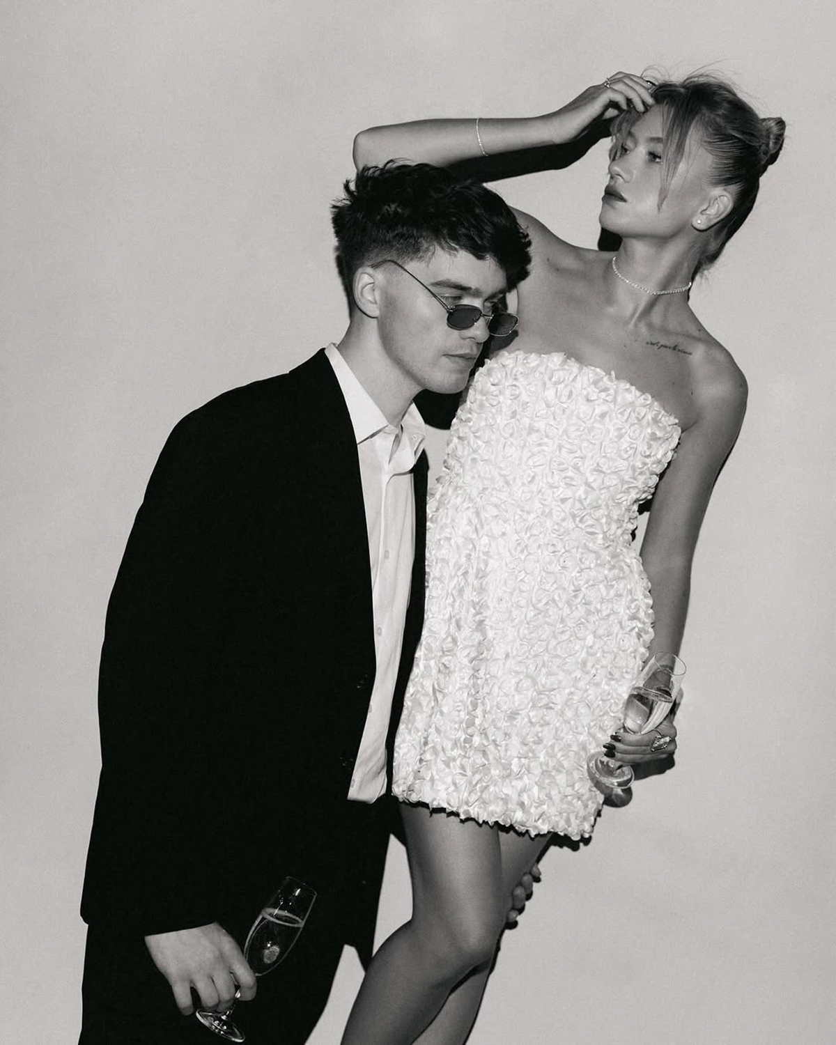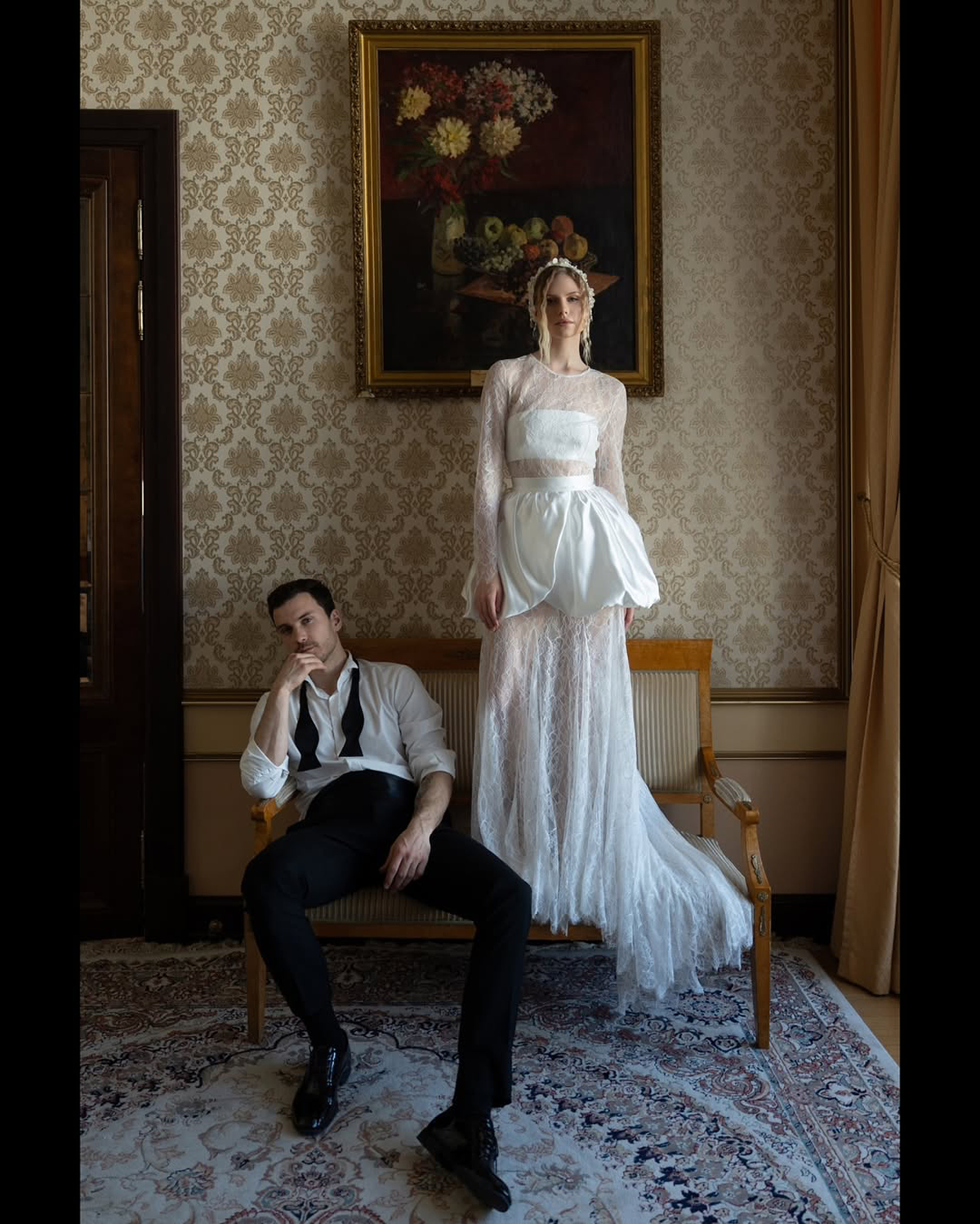 Formal photos aside, it’s time to play with height. Instantly add visual tension with one partner seated while the other stands on a chair, step, or platform. The change in levels draws the eye, sharpens the composition, and gives the frame a fashion-editorial edge. It’s a simple adjustment that delivers a stronger silhouette and more dynamic body language, and is a fun way to capture more serious portraits, either before or after the ceremony, without slipping back into traditional posing.