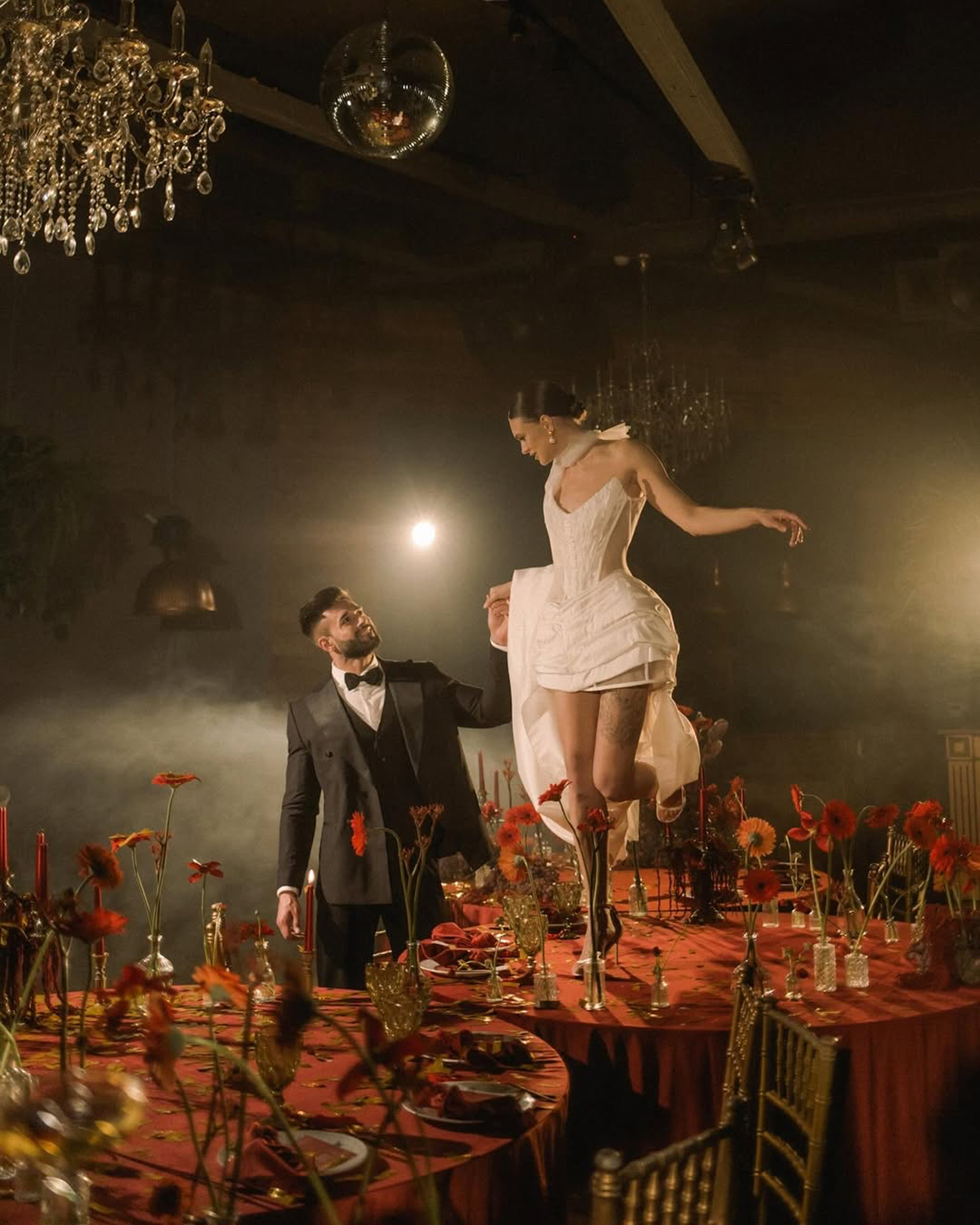 Bring instant attitude with one or both partners playfully standing on the table. It breaks expectations and shifts the energy from formal to fashion-forward. These photos are most impactful when the reception tables become graphic stages, incorporating your decor and florals into a dramatic moment.