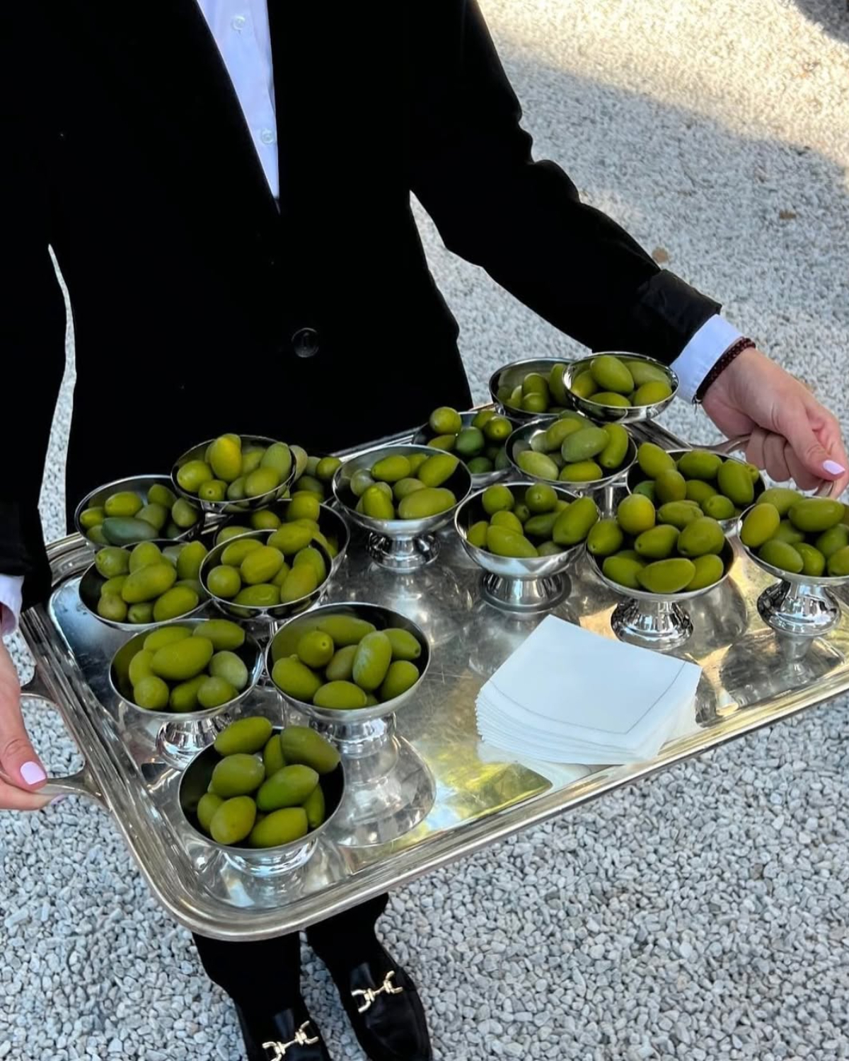 Skip the toothpicks and bowls—these days, olives are getting the VIP treatment. Think coupe glasses stacked into champagne-tower-style displays, silver vessels glinting in candlelight, and perfect green globes arranged with almost sculptural precision. Whether served solo, spiced with citrus peel, or paired with pickled veg, it’s a salty, show-stopping bite that sets the tone before dinner even begins. Chic, efficient, and simple.