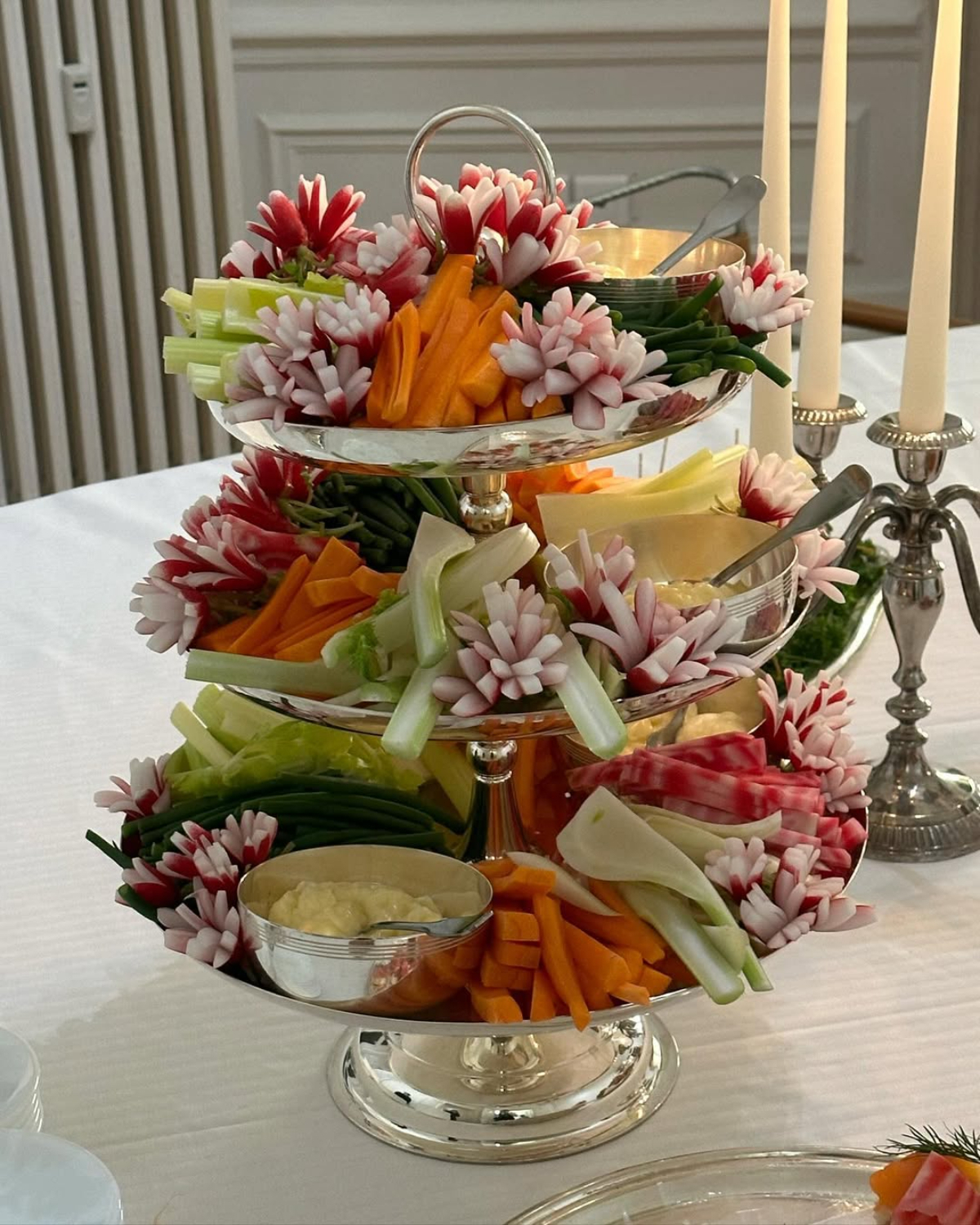 Forget your average veggie platter. These arrangements elevate the humble crudité to centerpiece status—served in coupe glasses, tiered trays, and ornate silver vessels. From carved radish flowers to ice-chilled carrots and gem lettuce fronds nestled in creamy dips, this setup is all about drama and decadence. Whether displayed as towers, tiers, or sculptural installations, the message is clear: vegetables, but make it opulent.