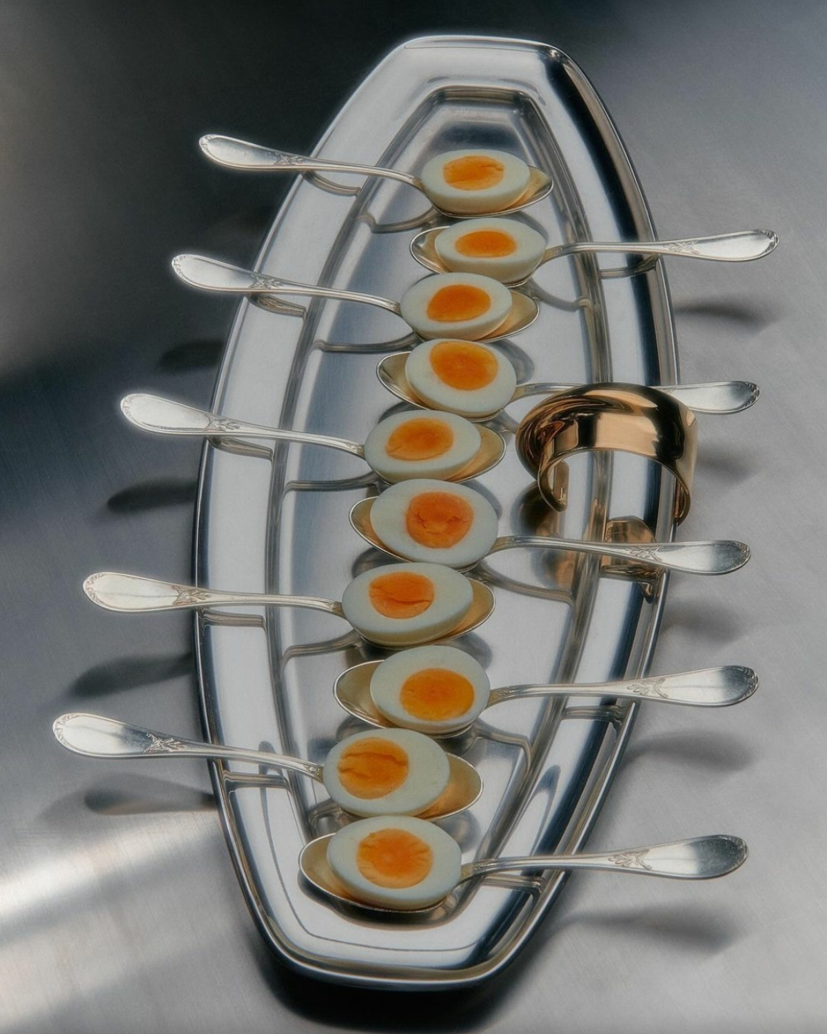 There’s something quietly elegant about half an egg served on its own silver spoon. Whether soft-boiled, topped with mousse, or piped with pea purée, these bite-sized beauties feel ceremonial—especially when arranged on mirrored trays or polished silver. The humble egg, but make it wedding-worthy.