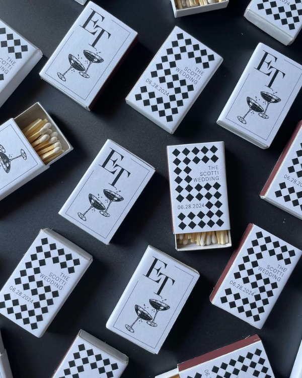 For a celebration with effortless vintage charm, gift guests mini cocktail kits that exude cool sophistication. Include a martini shaker or a sleek cocktail glass for guests to take home, elevating the experience beyond the party. Pair the kits with engraved matchboxes—equal parts stylish keepsake and functional flair. Elevate the aesthetic by packaging the kits in retro-inspired designs, like deep red hues, art deco patterns, or gold foil accents, for a look that feels both timeless and effortlessly cool.