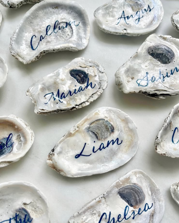 Bring a touch of seaside sophistication to your favors with oyster shells that double as decorative catch-all dishes. Personalize them with guest names to make them serve double duty as place cards. For a luxurious twist, mother-of-pearl caviar spoons or shell-shaped chocolates and candles add that chic coastal flair. To tie it all together, package these items in soft ocean-inspired hues like sandy beige or seafoam green.