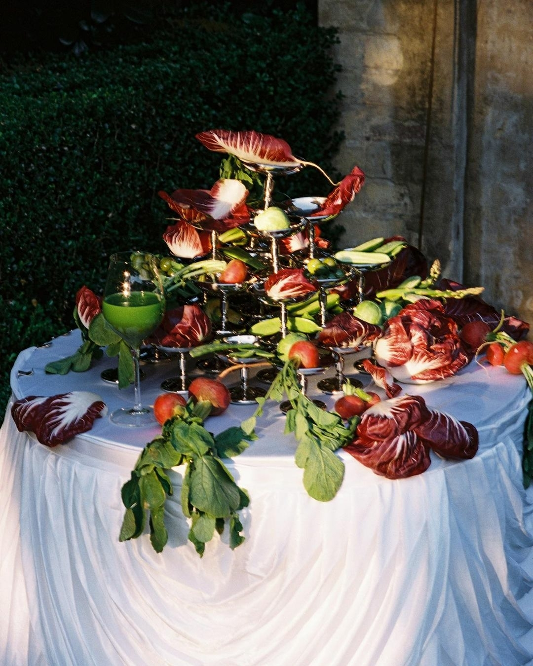 With its stylish and intimate ambiance, the Verde on Verde editorial is a story of love infused with European charm. The creative team, featuring THE WED member Film & Foliage, meticulously fashioned an atmospheric backdrop where Tom & Holly's precious moments beautifully unfolded. Green takes center stage in every detail, from a wonderful garden venue to a one-of-a-kind tablescape for a uniquely fresh approach in all aspects. Vibrant vegetables, drapery, and delicate ribbons intertwine with a gleam of antique silver, crafting an ambiance that is both opulent and refreshingly modern. Effortlessly woven, each element paints a portrait of romance unlike any other.