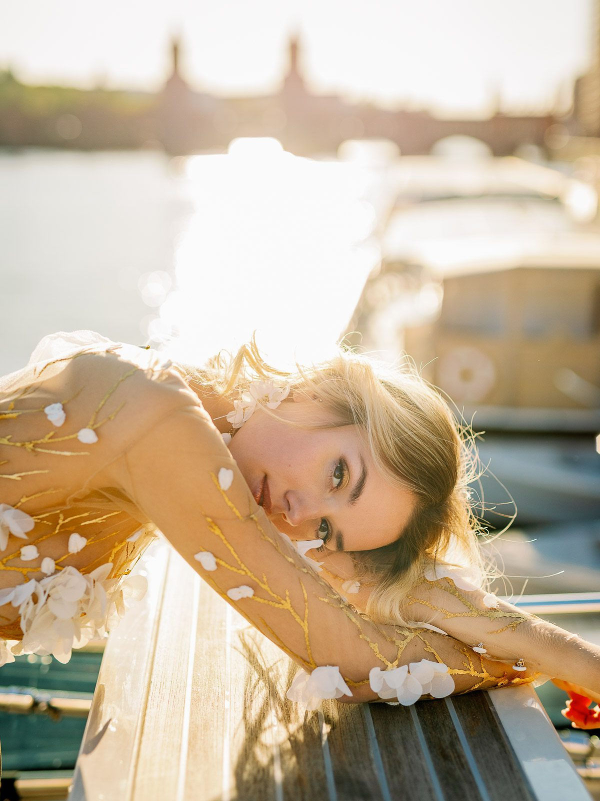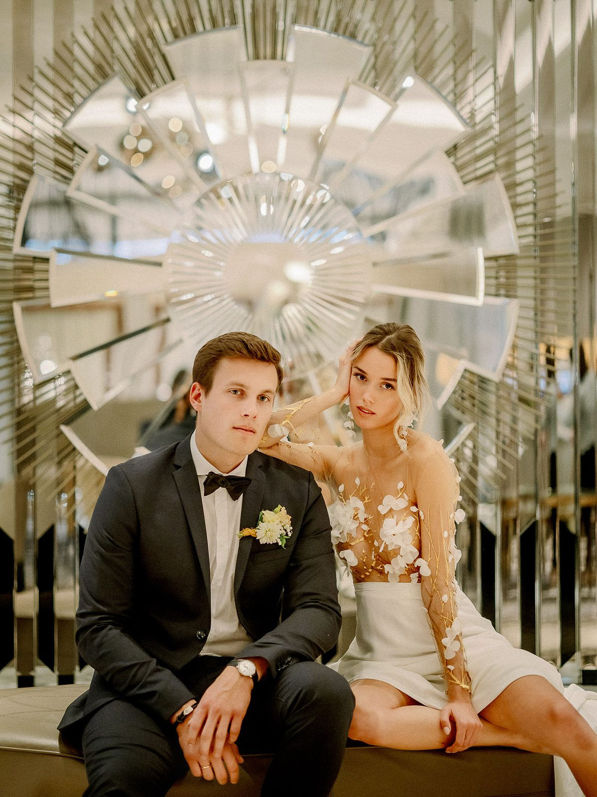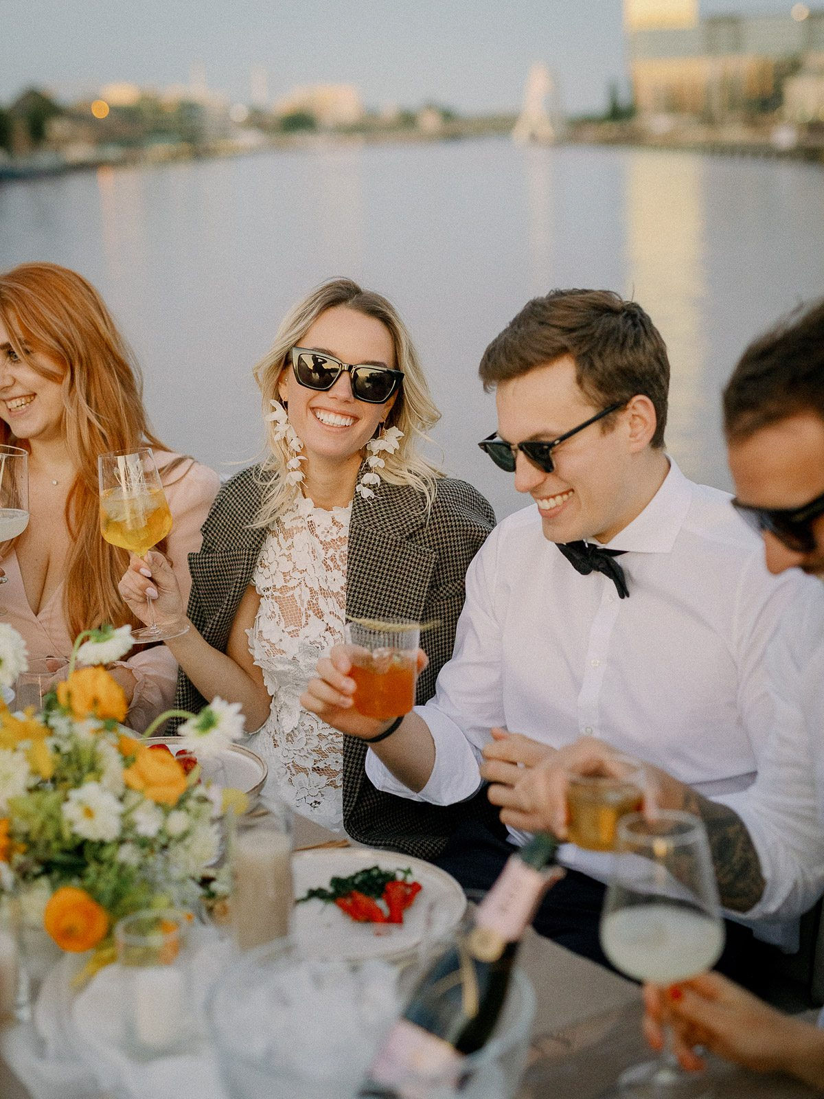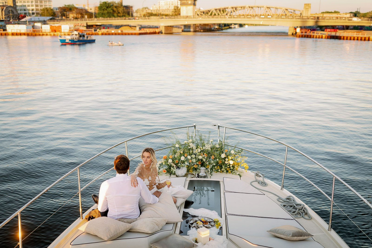 "At the pulse of the capital Berlin, luxurious metropolitan flair meets pure romance. Our couple enjoyed their Getting Ready in an exclusive suite at the Ritz Carlton Hotel. Michelle wore bespoke dresses by a French designer Geraldine Daulon: a golden dress for the ceremony and a second dress for the party after. A private wedding ceremony took place at sunset on a luxury yacht on the Spree, in the middle of Berlin. An intimate marriage vows, ring swap, oyster picnic on board, the skyline of Berlin in the background - a feeling of freedom and exclusive tranquility and yet at the pulse of the city. The day ended with a private dinner on board the yacht with friends and high-quality seafood and drinks. When we planned this elopement, we wanted to combine clean lines, minimalist elements, and natural sandy tones with extravagant golden accessories to create a modern, casual feeling that looks high-quality and cool at the same time," — says Mila from Vivid Symphony.