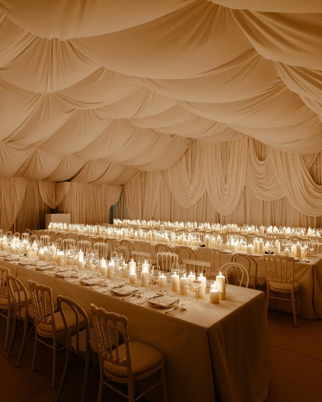 Whether your wedding is a chic indoor affair or a dreamy garden celebration, chandeliers create a striking focal point and instantly elevate the atmosphere of your wedding. Hang crystal or wrought iron designs above reception tables, dance floors, or outdoor spaces to adorn the venue in vintage glamour. Enhance the effect by dimming the lights and letting the chandeliers cast a warm, romantic glow.