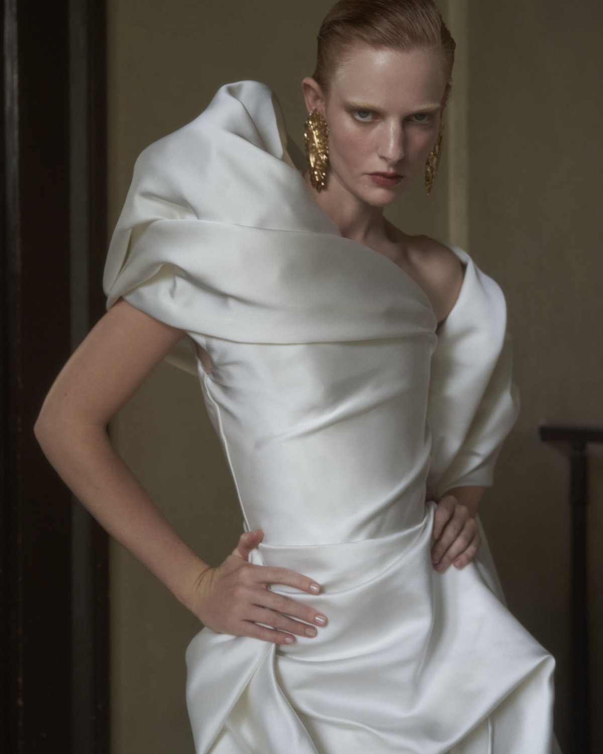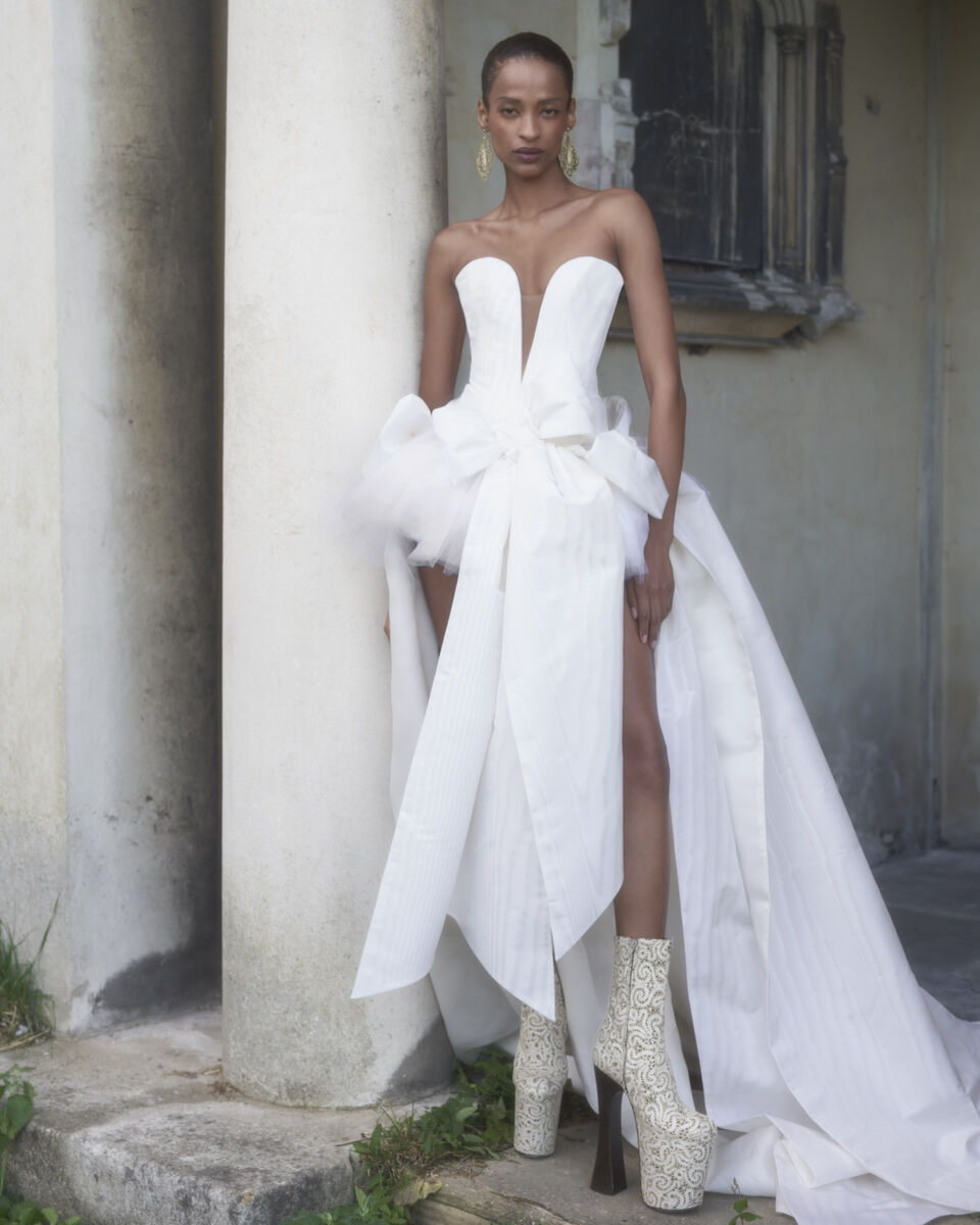 Enchanting Victoria-style silhouettes are reimagined with a contemporary twist, creating a season that embodies modern opulence. The Couture collection explores an air of regality, showcasing dramatic volumes sculpted from panniers, petticoats and drapery, anchored by corsetry that beautifully accentuates the female form. In contrast, the Made-to-Order collection offers a more demure approach, featuring a modern, minimalist interpretation of the era’s signature elements—think elegant draped necklines, playful bubble skirts, dropped waists, gloves and, of course, exquisite corsetry.