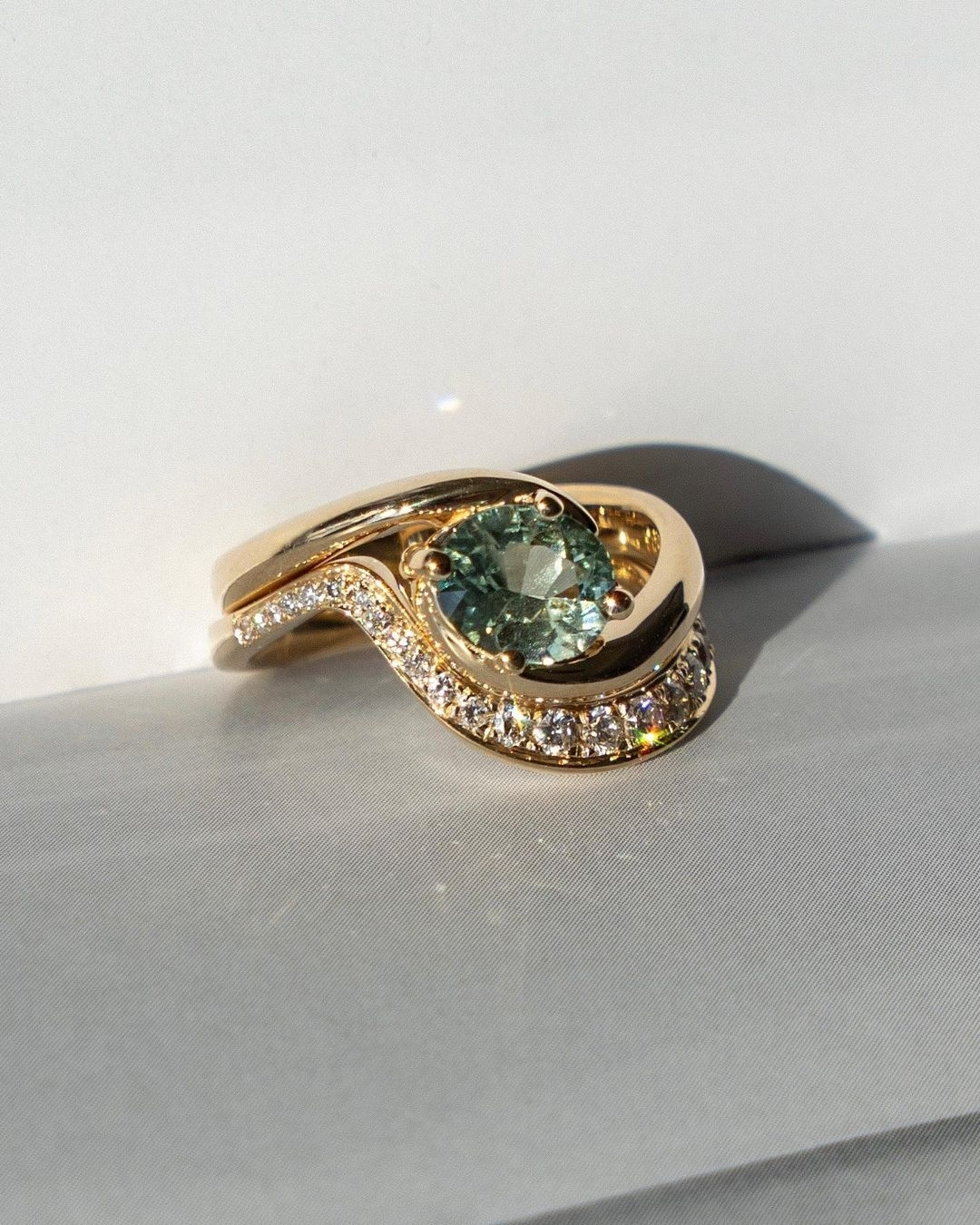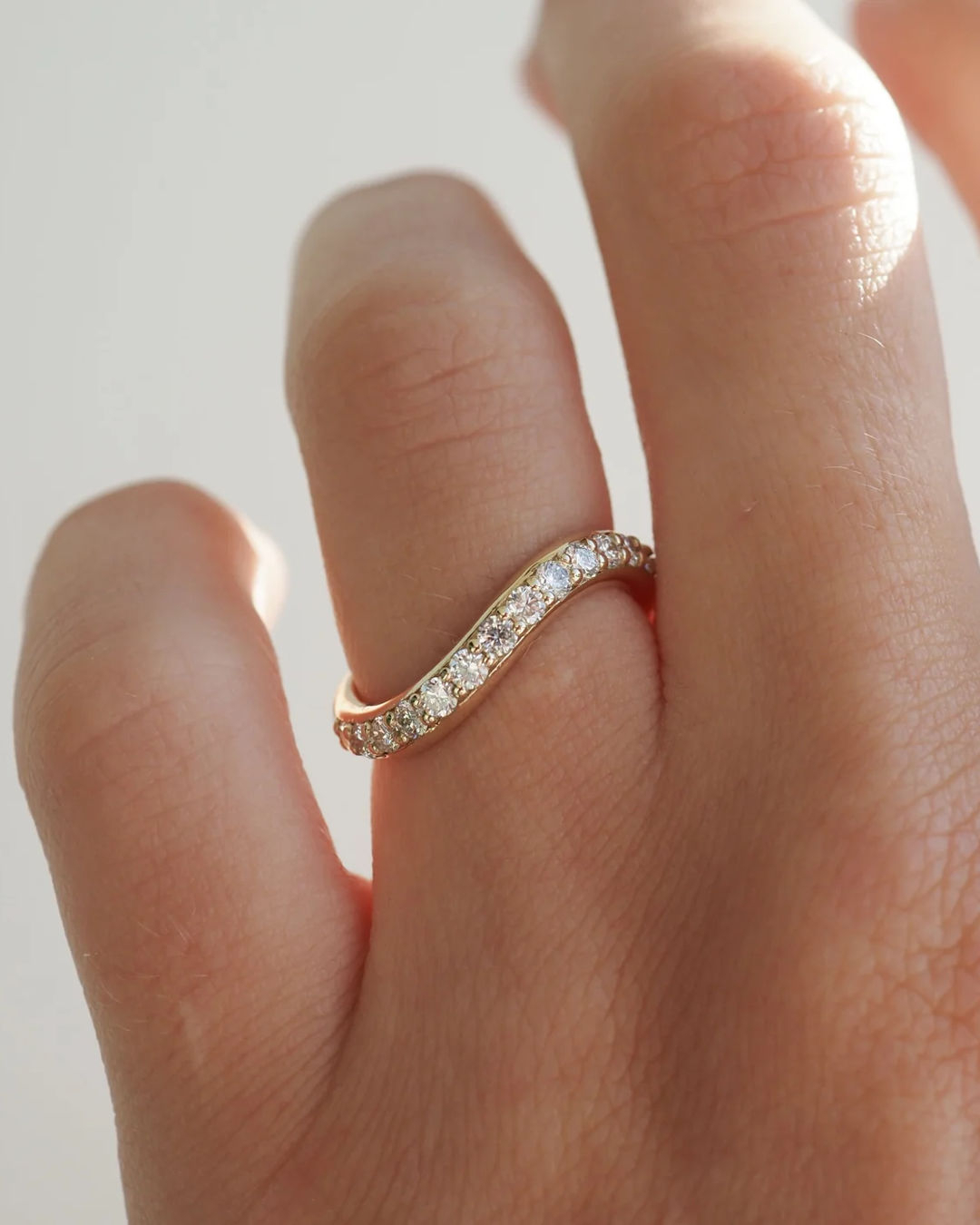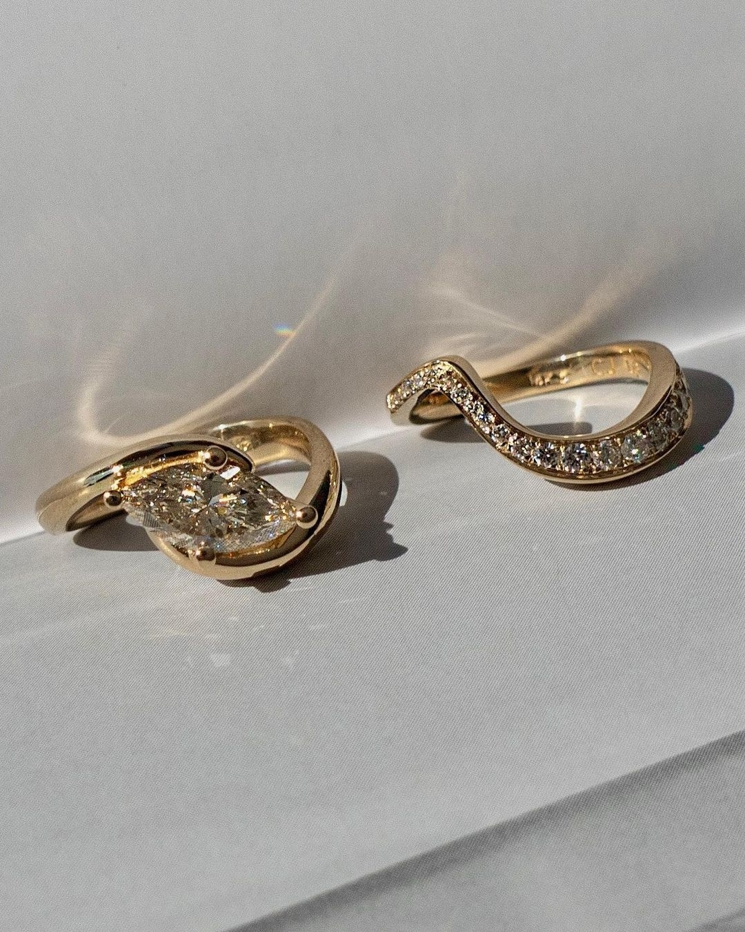 One of our personal favorite wedding ring trends lately is wave-like bands. Super versatile and ultra-modern, they blend effortlessly with other jewelry pieces, opening up endless possibilities for personalization and experimentation. Whether adorned with precious stones or kept simple, wavy rings add an artisanal touch, breathing sophistication and creativity for the uniquely fashionable bride.
