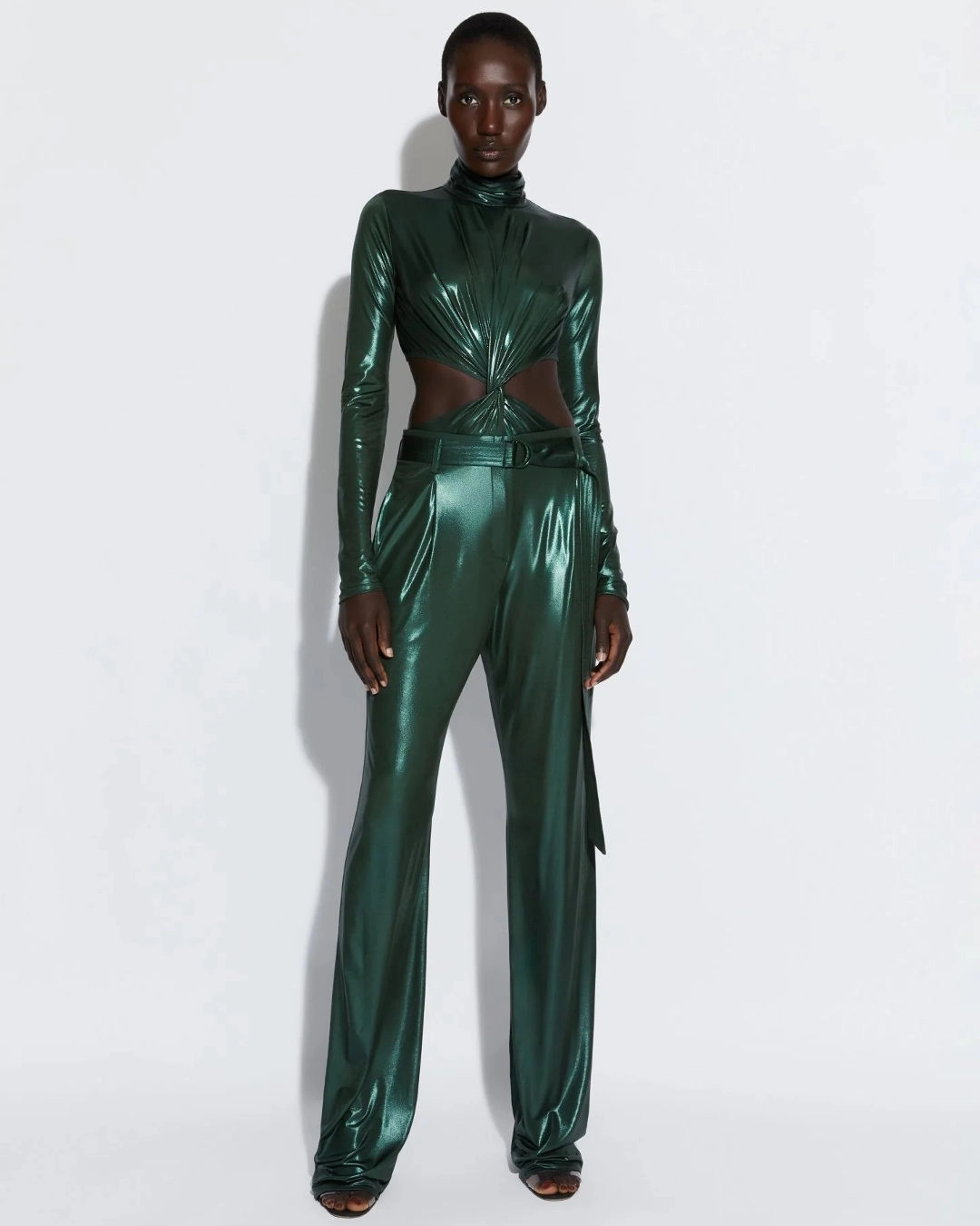 La Pointe Shiny Jersey Turtleneck Bodysuit, $750, and, Pants, $850