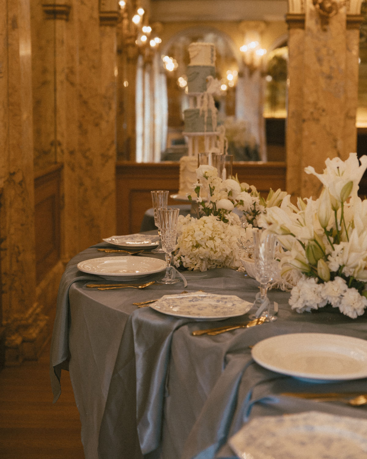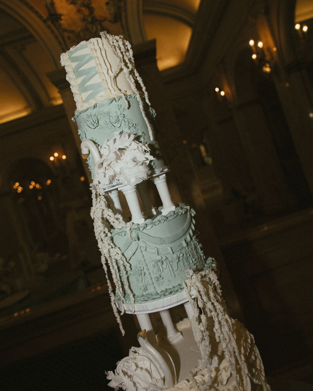 Every detail is meticulously composed, weaving a story of tactile luxury and layered emotion. Ornate tablescapes glimmer with porcelain swans, cascading pearls, and billowing white florals, conjuring a dreamscape both ethereal and indulgent. A towering pastel-hued cake, sheathed in delicate sugar lace, rises like an architectural marvel — an edible testament to artistry. The softness of fresh lilies, the cool shimmer of silk ribbons, and the flickering glow of candlelight add to the atmosphere of hushed grandeur.