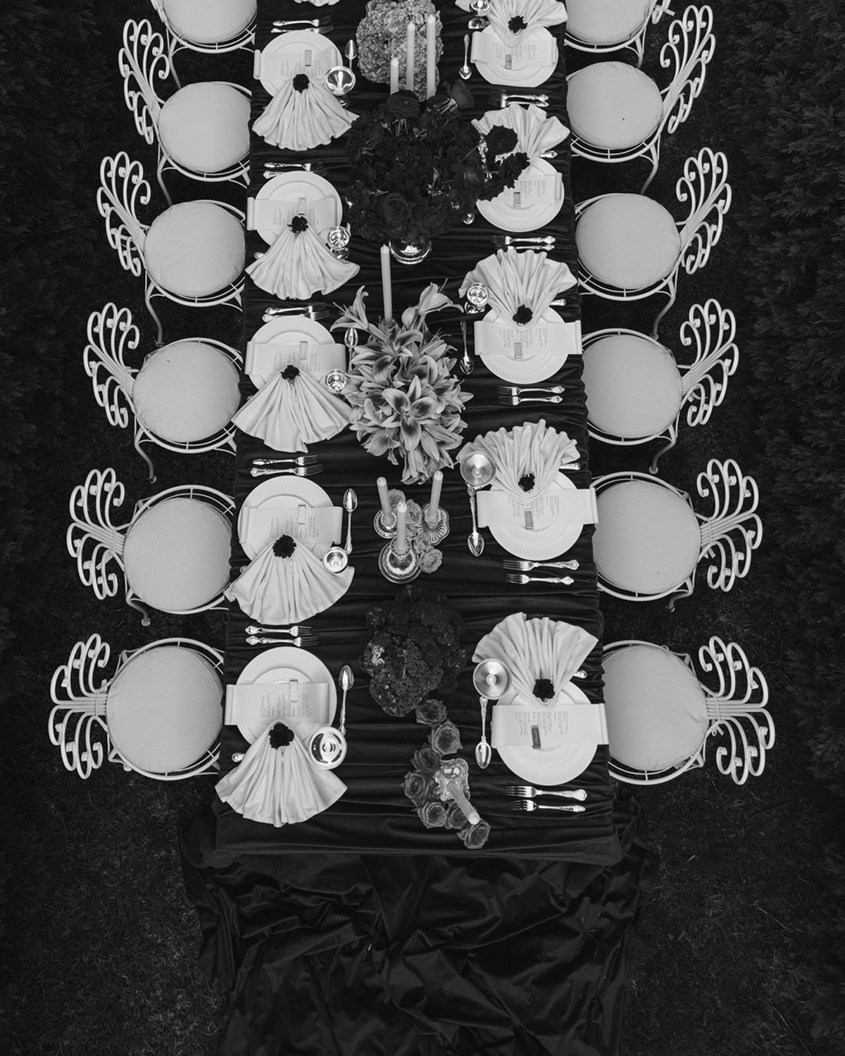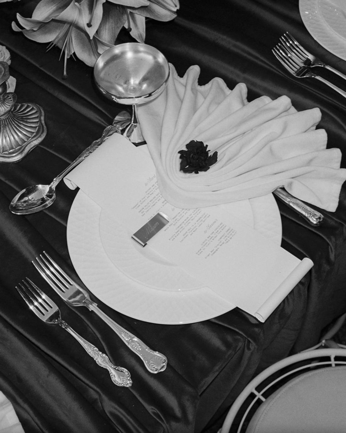 The tablescape draws inspiration from the romance of vintage silver, high-society soirées, and classic European formality. Each detail—folded napkins like fans, engraved place settings, floral arrangements with unexpected structure—feels at once archival and avant-garde.