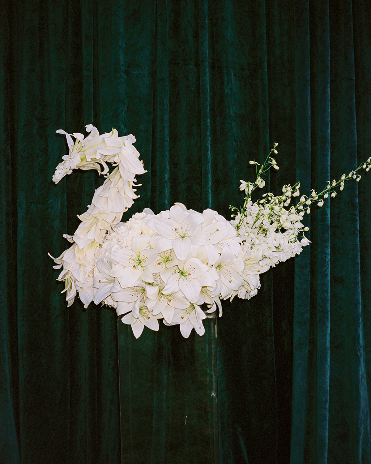 Set against the breathtaking backdrop of Krinklewood Estate, a quietly cinematic scene unfolds as two lovers seal their promise, surrounded by a cascade of blooms gathered en masse, spilling over sculptural fabric in soft, rhythmic waves. Nearby, a single swan—formed entirely of lilies—stands in serene stillness, echoing the sculptural elegance of the moment.
